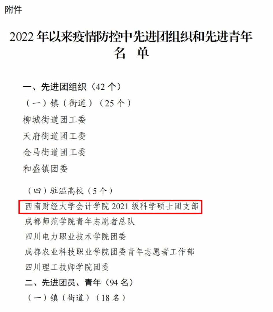 为大力弘扬抗疫精神和志愿者精神,激发斗志、鼓舞干劲,共青团成都市温江区委员会对2022年以来疫情防控工作中表现突出的42个基层团组织和94名青年予以表彰,yl1111永利集团会计学院2021级科学...