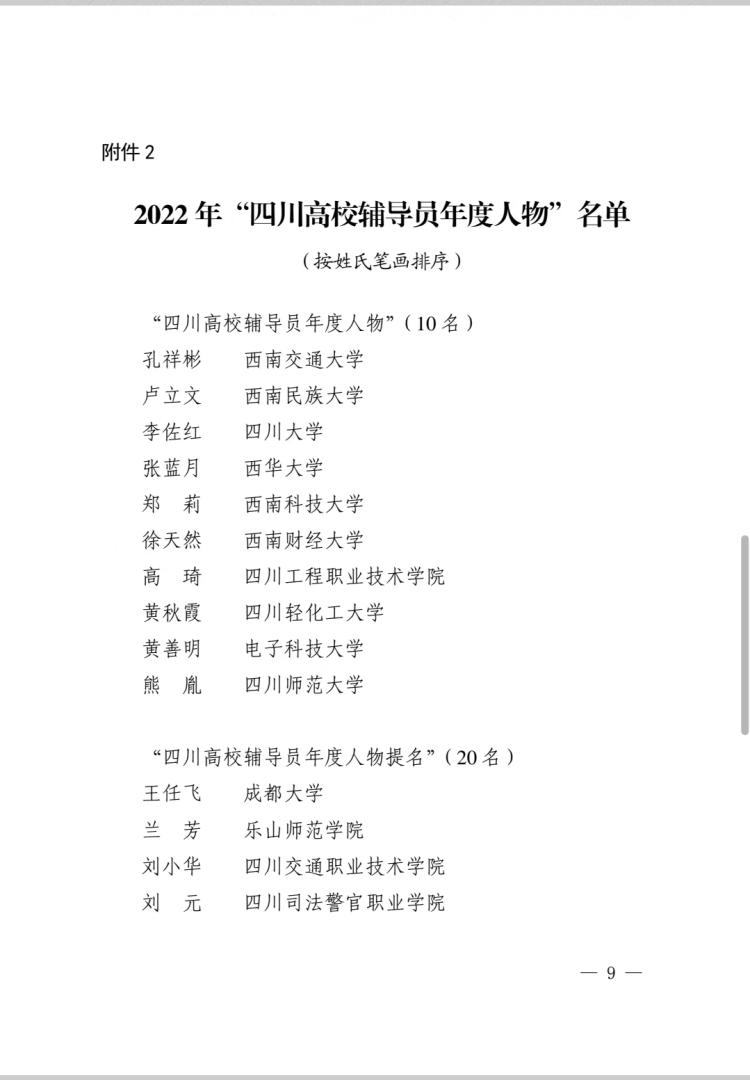近日,由中共四川省委教育工委、省教育厅组织的“2022年四川高校辅导员年度人物”评选结果揭晓,我院辅导员徐天然荣获“2022年四川高校辅导员年度人物”称号。 此次评选以辅导员个人事迹及工...