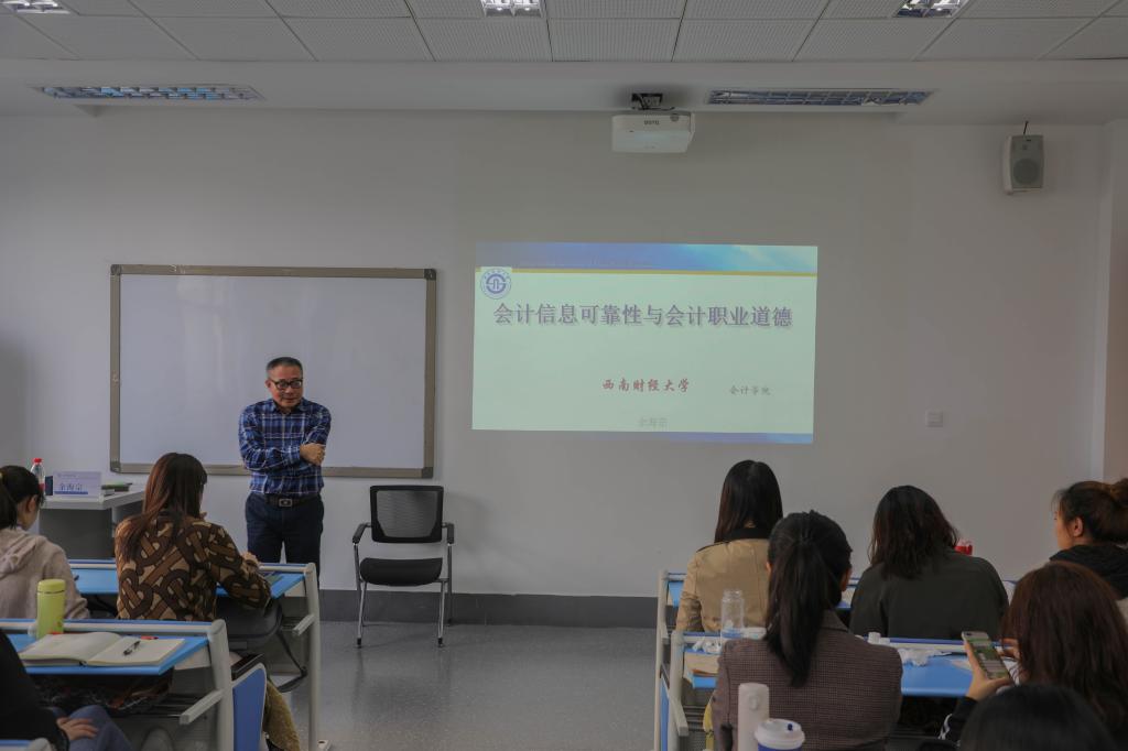 为贯彻落实全国教育大会和高校思政工作会议精神,切实推动主题教育检视问题的整改落实,深入打造“三全育人”大格局,会计学院召集资深教授发挥专业优势特长,结合思政工作要求,集中精力,合力打造“会计·思政大讲堂”。通过深入挖掘专业讲座中的思政元素,结合专业发展和学科背景,深入学生讲思政课。11月8日14:30,会计学院“会人会语之思政大讲坛”第一期暨文化素质讲座“会计信息可靠性与会计职业道德”在光华校区裙楼2202开讲。本场讲座由会计学院90级校友、审计系主任余海宗教授主讲,2020级MPAcc专业(02方向)全体学生参与了线下学习,2018级财务管理专业等部分学生参与了线上学习。讲座由2020级MPAcc专业(02方向)辅导员高赟老师主持。