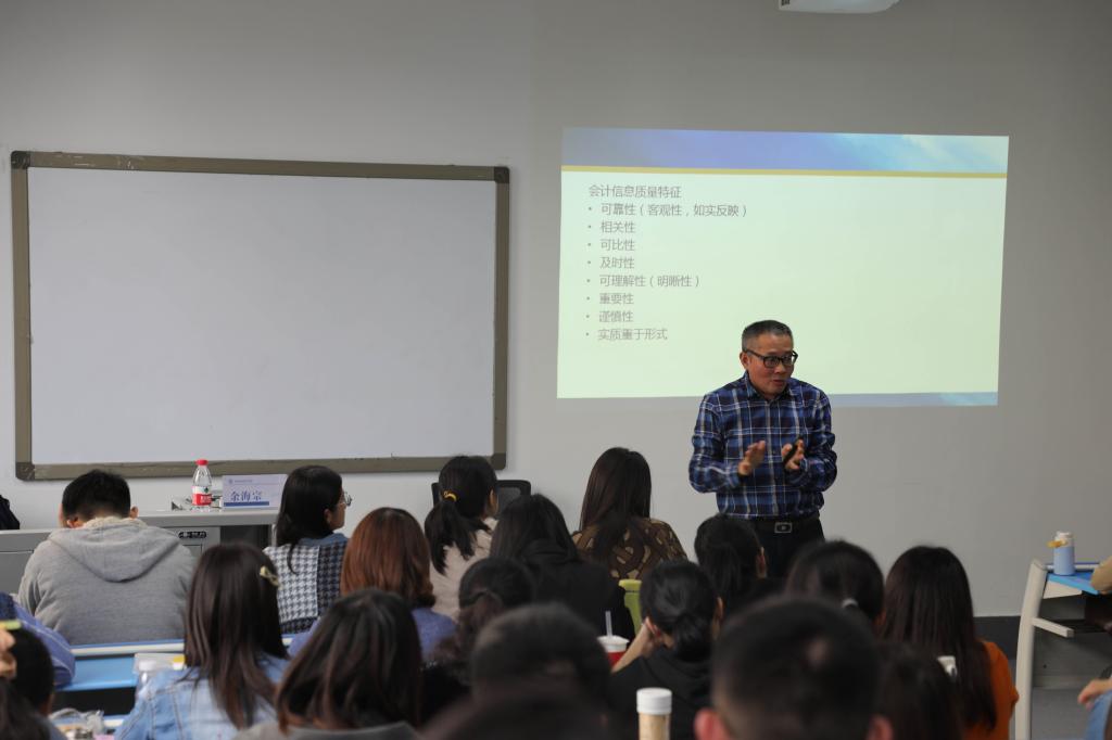 讲座伊始,余海宗教授用“225魏志刚受贿事件”等三个因有违职业道德规范而受到惩戒的案例引入讲座主题。他首先向同学们讲解了广义职业道德和狭义职业道德的概念,然后给大家讲解了会计职业道德的功能。在简述会计职业道德与会计法律制度之间的区别和关联后,余老师还耐心为同学们讲授了会计职业道德的主要内容,并特别强调和论述了“客观公正”是会计职业道德最为根本的一点。接着,他讲解了几大会计信息质量特征,并向学生指出:会计准则的核心和会计职业道德的核心有着密切的内在联系,它们是相互契合的。此后,余教授带着同学们一起进行案例分析:瑞幸咖啡财务舞弊的主要手法与“双康”(康美药业和康得新)的财务造假。并通过康美的案例告诉同学们,研究存贷双高的公司也是当下的一个热点。在完成几道关于职业道德的题目后,余老师举了三个常见的违背会计职业道德规范的现象,告诫同学们千万不能触犯职业道德底线,并引用了习近平总书记提出青年要“扣好人生第一粒扣子”来告诉同学们要树立正确的价值观,人生观。