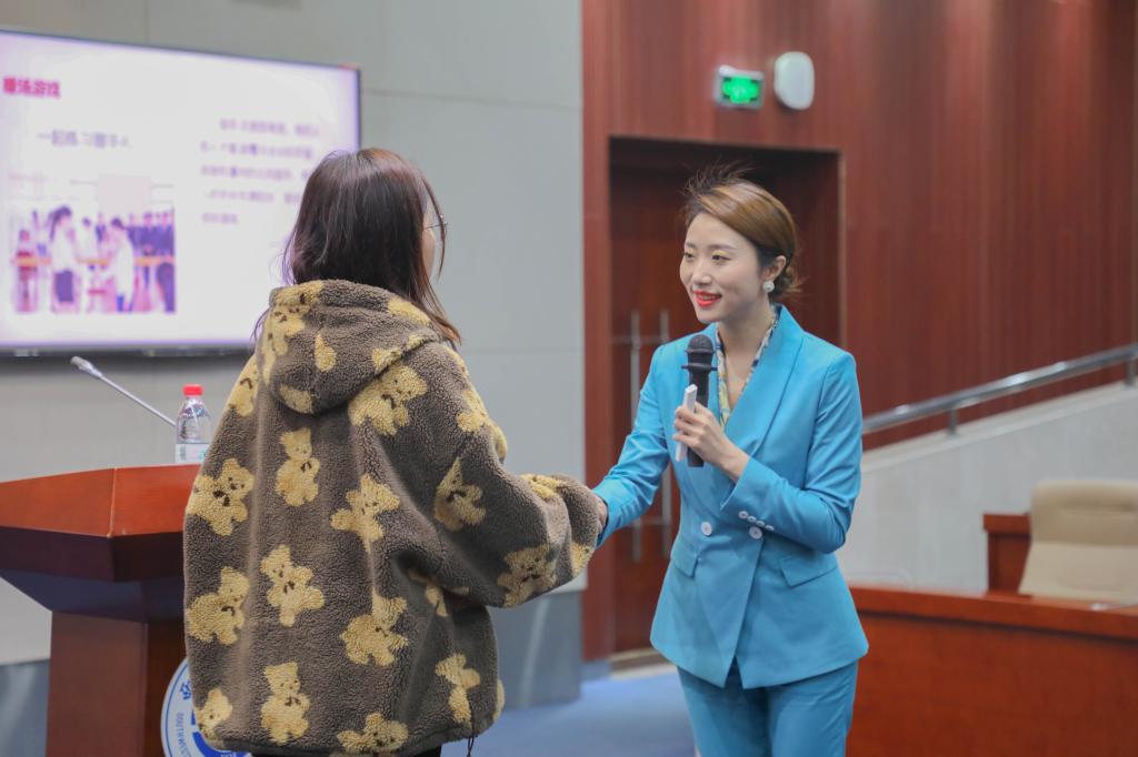 赵斯斯老师是yl1111永利集团特邀培训师,美国ACIC国际注册高级礼仪培训师,全国第九届残运会暨第六届特奥会礼仪培训师,中国女性形象工程礼仪讲师团讲师,教育部职业核心能力礼仪培训师,中国儿童礼仪教育协会高级讲师,曾受邀为全国多家知名企业事业单位和高校授课与培训。赵老师首先从基础握手礼节的注意事项引入公务礼仪的话题。通过让每位观众与自己左右两边的人相互握手,亲身感受需注意的礼仪细节。握手时要“上步并脚握,掌心相对,力度七分,三到五下,目光对视,语言交流”,同时也要遵循尊者先伸手的原则。接着赵老师用实例展示了礼仪的重要性。礼仪不仅是公务与涉外工作的窗口,还是一门综合的艺术,它具有高度的政治性和政策性。开展工作时,礼仪需先行。她仔细地分享了职业形象塑造方面的注意事项,包括发型、服饰、表情语言和肢体语言。“君子之修身也,内正其心,外正其容”。一处处小细节的外观改变,就能让他人的感受大不同。