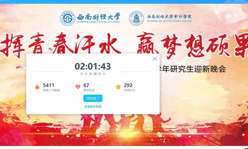 除了节目的展示,晚会过程中还播放了各班的风采展示视频,这一环节不仅加强了研究生同学们相互之间的了解,也有利于增强班级的凝聚力和归属感。此外,直播中的抽奖环节也是晚会的一大亮点,提高了同学们的活动参与感且增加了观众们对直播的观看兴趣。