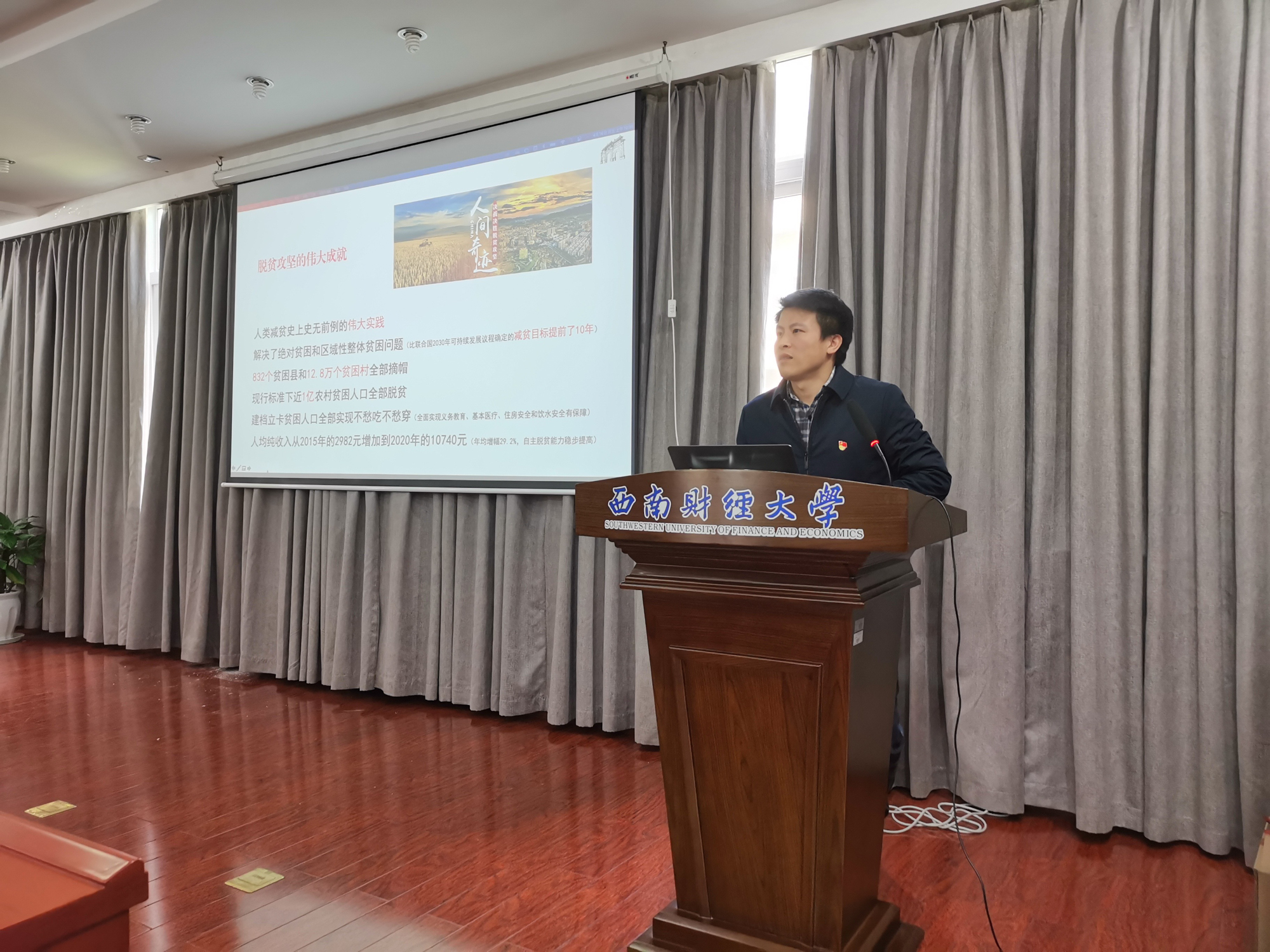 共建会议结束后,学生职业规划与就业指导中心党支部宣传委员罗锋结合自己参与脱贫攻坚工作实践,为两个支部党员讲授了“党史学习教育——脱贫攻坚的历史与实践”专题党课。