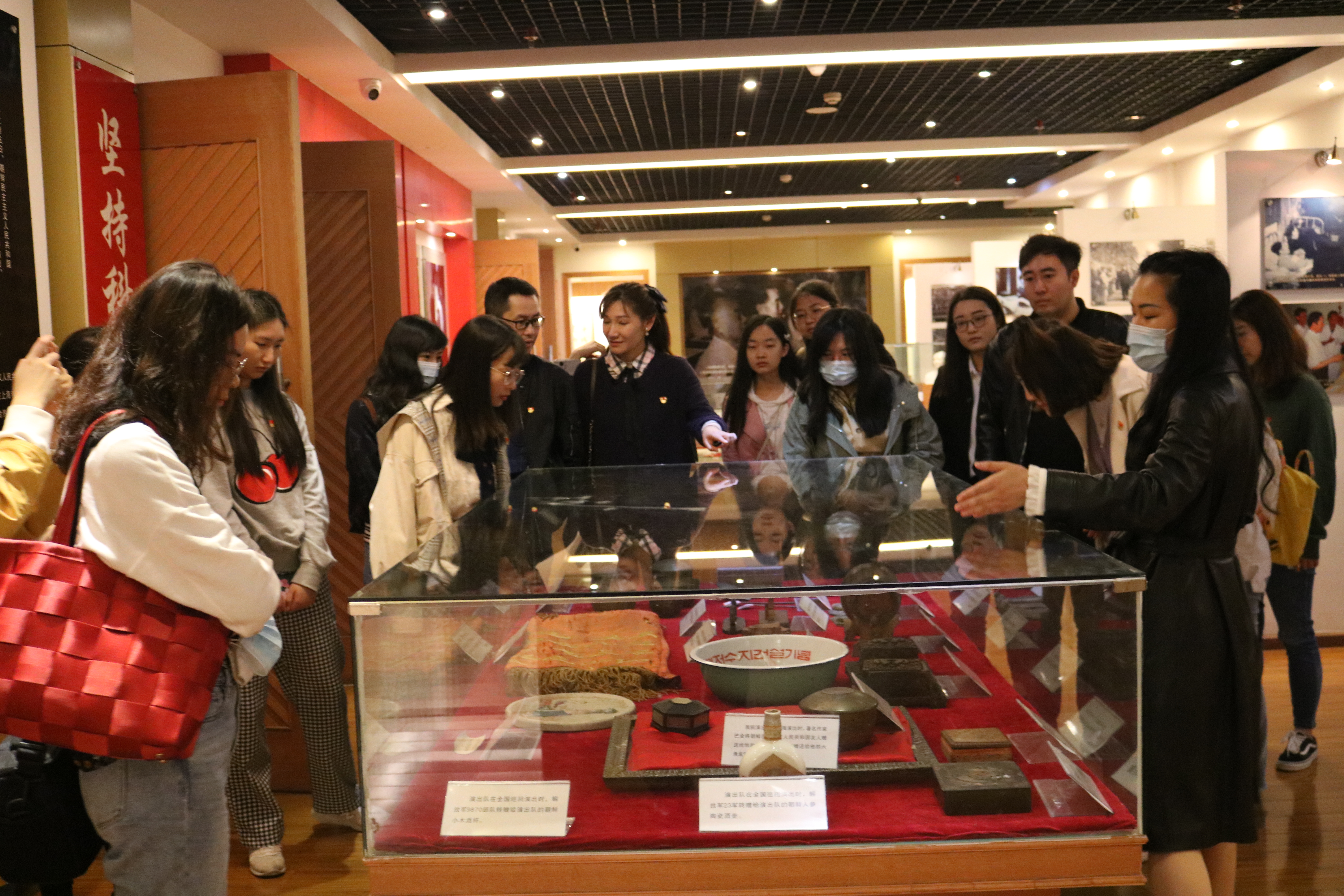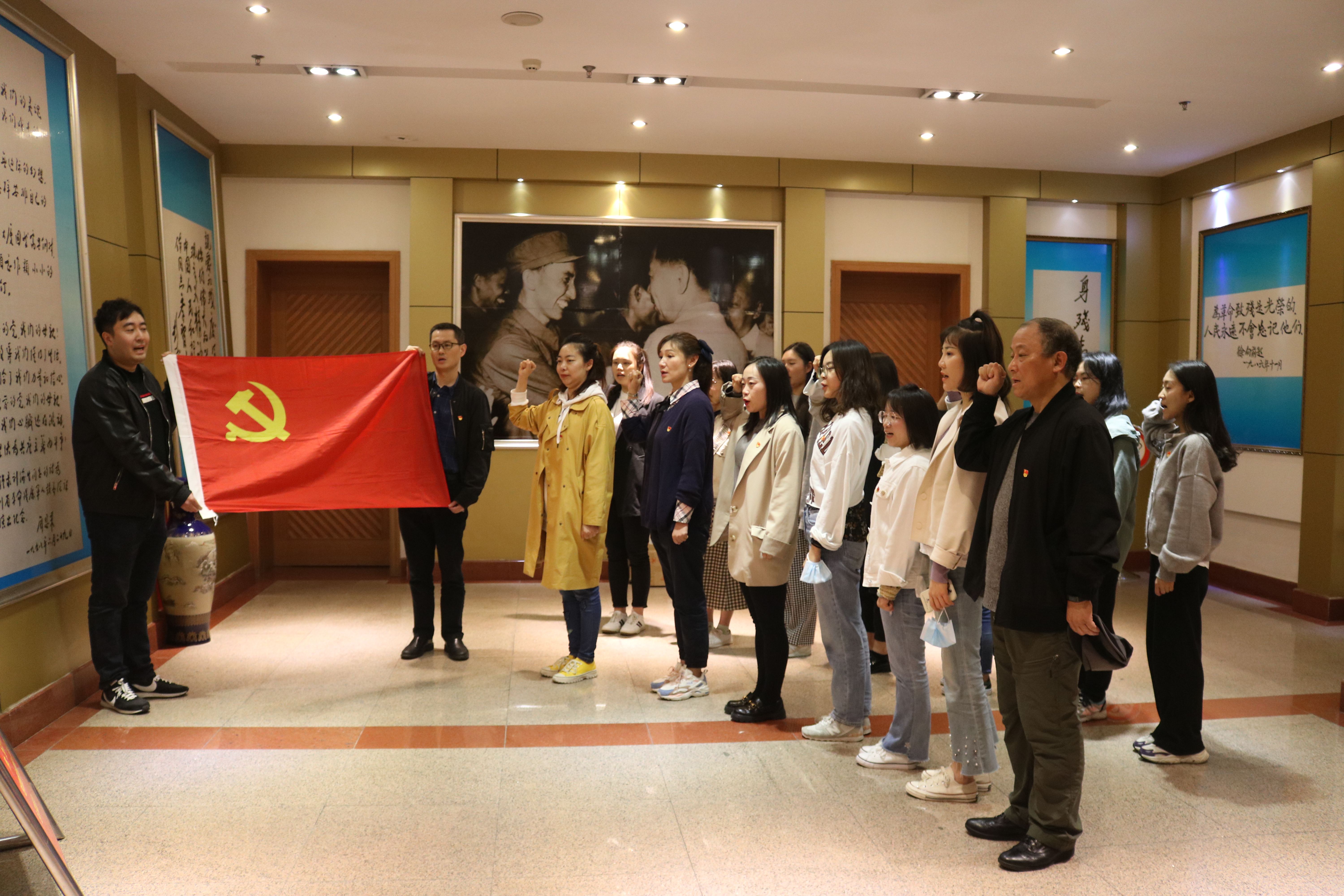 到了博物馆,支部党员同志佩戴党员徽章,站在周恩来总理亲笔抄录的《我们的心永远忠于党》前,面对鲜红的党旗,举起右手,重温入党誓词,回顾入党初心,牢记庄严承诺。