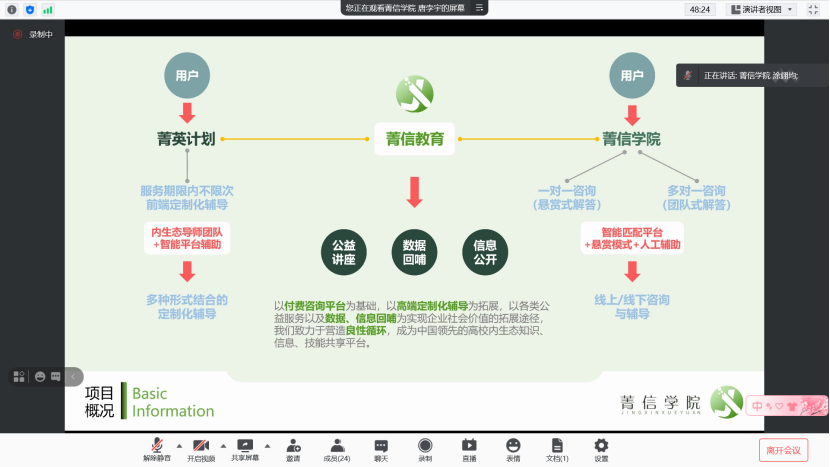 比赛开始时,由主持人首先介绍比赛规则和流程。每个团队依次通过屏幕以及线上语音形式进行限时5分钟路演,随后评委老师进行提问,团队成员对其进行作答,答辩结束后各位评委老师根据路演和答辩表现进行打分,最后进行统一的评分公示。