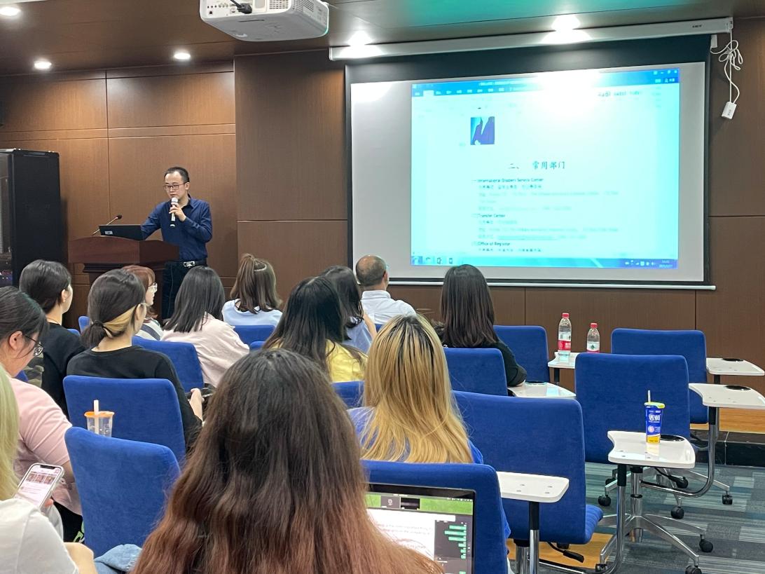 徐天然老师首先为同学们详细介绍了纽约城市大学巴鲁学院的相关信息,并就学习、疫苗、租房、安全、境外保险等事宜进行了讲解,提醒同学们做好巴鲁入学前的过渡。郝若欣老师为大家梳理了教材、实习报告等教务安排,同时也强调了毕业论文的时间线,督促同学们提前规划好大四的时间安排。董航老师简短介绍了交换生系统的操作步骤、项目专项奖学金的申请流程,并结合事例讲授了基本的邮件、面试礼仪规范。同时,项目老师补充推荐了重要的公众号平台,内容涉及平安留学、领事保护、机票动态等多方面信息。