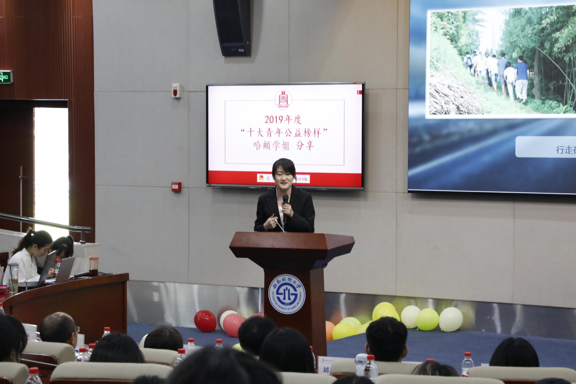 随后,2019年度“十大青年公益榜样”哈頔学姐分享了自己参与红色计划的经历。面对暴雨拦路,他们毅然前行,只为了577公里外的一份期待。这正是西财学子志行天下精神的体现。