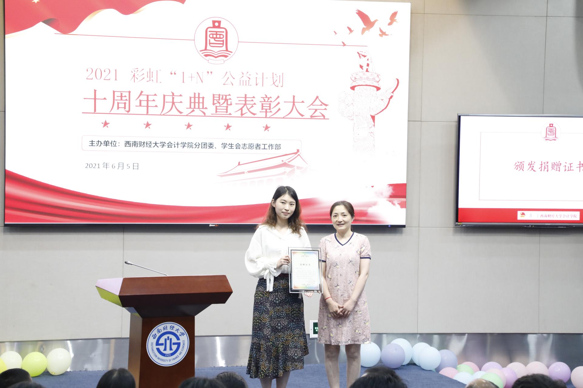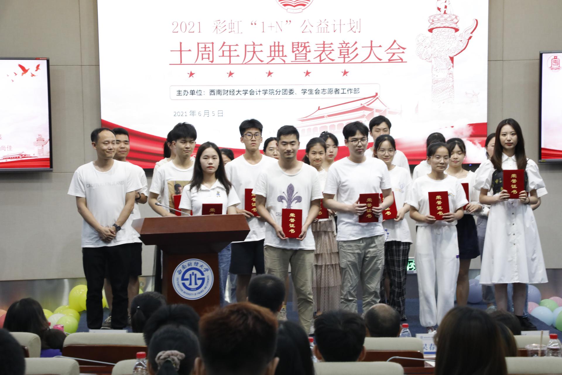 为庆祝会计学院彩虹“1+N”公益计划十周年,鼓励大学生积极参与志愿活动,会计学院于2021年6月5日下午14:00,在弘远楼200人厅成功举办“彩虹‘1+N’公益计划十周年庆典暨表彰大会”。会计学院分党委副书记吴春力、张太富,分团委书记刘坤,分团委副书记徐天然,校友李宏毓、李峥、简杨扬等参与会议。