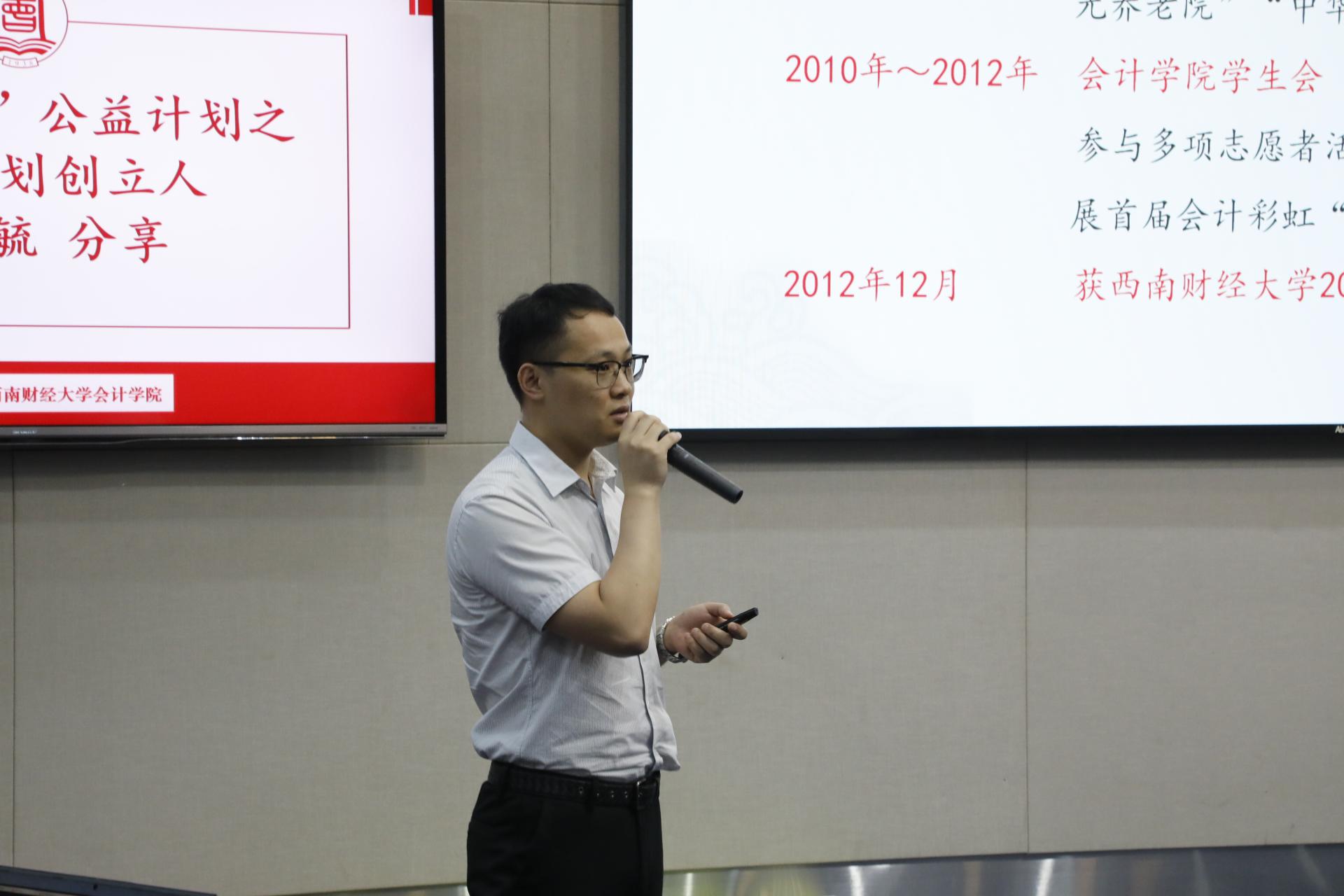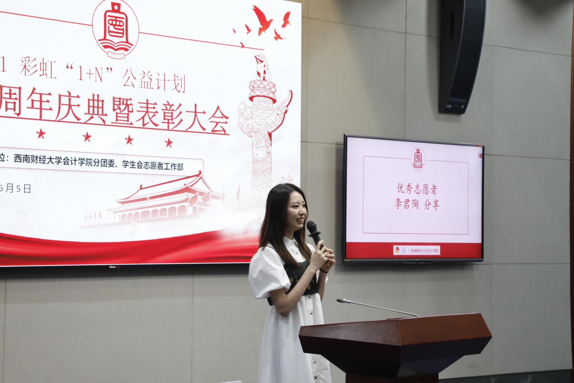 会议伊始,与会成员共同观看短片,回顾彩虹“1+N”计划十年的历程,对优秀志愿者们进行了表彰。红色计划创始人李宏毓学长分享了红色计划创立过程以及自己的志愿经历与感悟。他提到,红色计划志愿服务给他留下无数的感动和珍贵的回忆,希望学弟学妹们传承和发扬“大气为人,大志谋事,大爱行天下”的西财精神,将彩虹“1+N”计划生生不息的办下去,帮助越来越多的人。