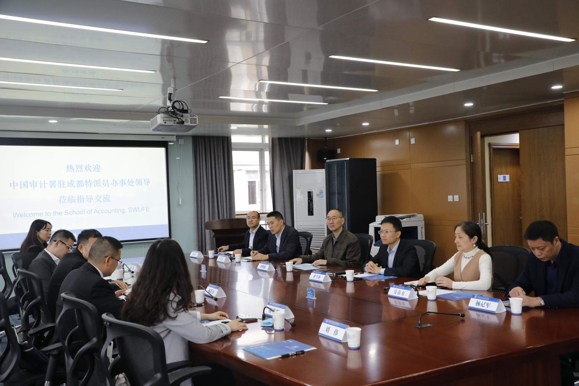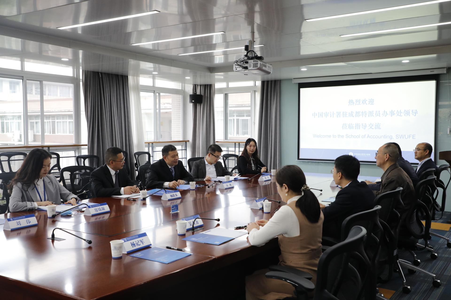 审计署成都特派办副特派员刘峰、人事教育处处长杨跃东、税收征管审计处副处长姬科及人事教育处副处长廖姝凝出席本次座谈会;会计学院领导和老师出席本次会议。