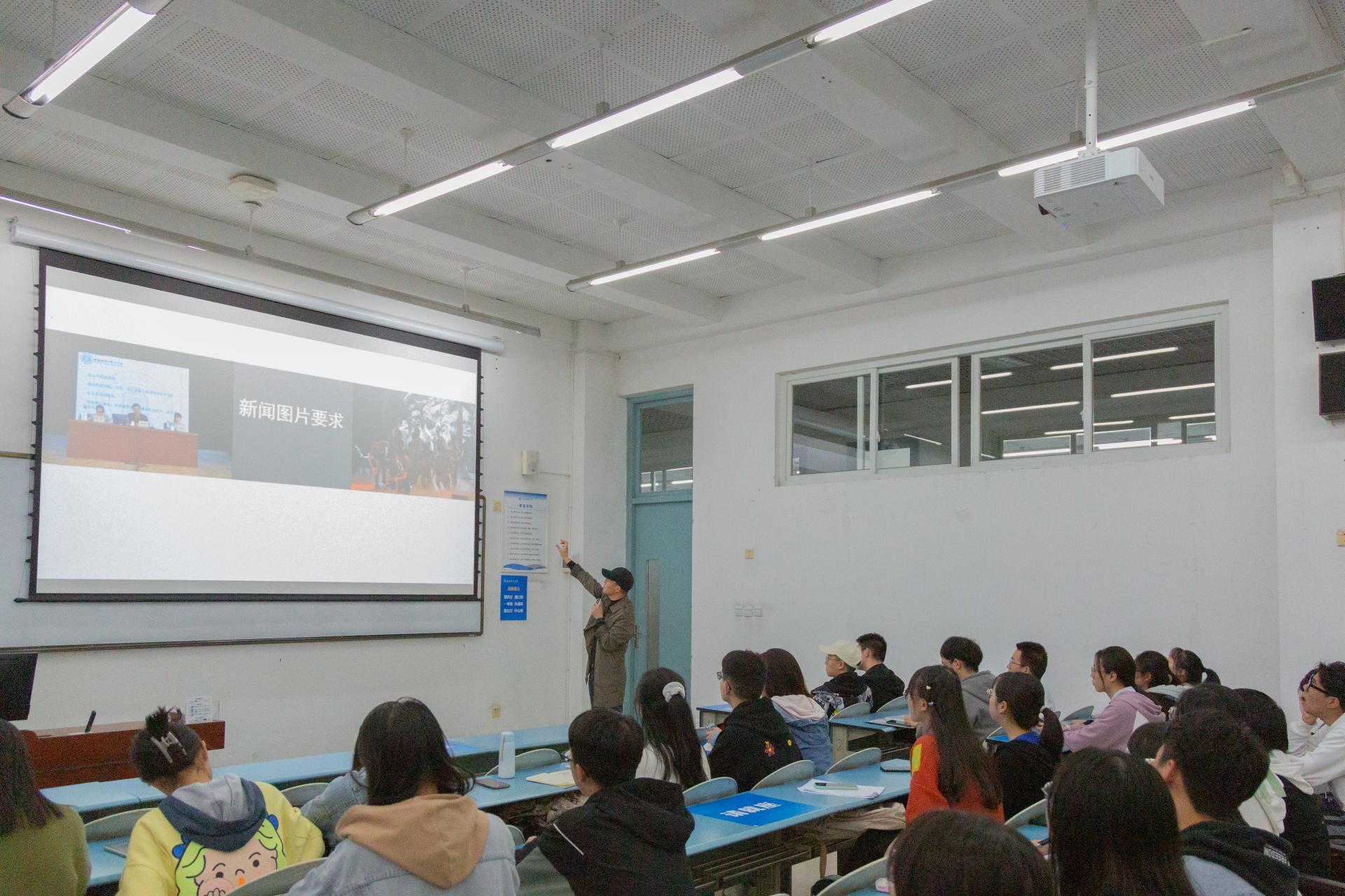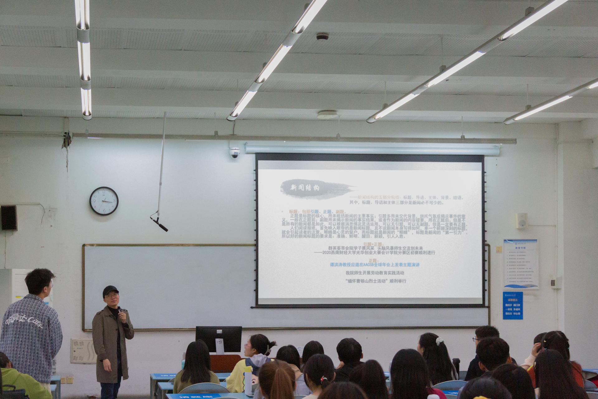 会上,何振雄老师主要从新闻写作基本要求、新闻五要素、新闻结构、新闻图片要求、新闻提交以及新闻挂网这六个部分为同学们讲解了新闻写作和拍摄的规范与技巧。他指出,新闻的“真实性”、“时效性”与“思想性”是新闻写作的基本要求,其中重点在于“翔实内容”与“提升思想”,这也是新闻主体的主要组成部分。随后何老师结合我院学生新闻写作的实际情况和要求,在每一部分穿插讲解了几个具有代表性的新闻稿实例,以理论与实践相结合的方式将每一部分内容讲述得更加清楚明了。提到对新闻图片的要求时,何老师指出,要尽量避免人物特写,注重图片质量,要多角度、全过程地记录整个新闻活动。针对新闻提交,何老师向我们提出了新闻稿提交的规范,包括署名、字号、分类等方面,并详细说明了挂网操作的流程与格式,特别强调同学们应提高自己的政治敏感度,谨慎挂网。