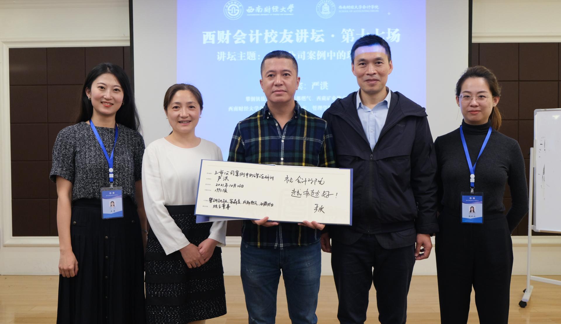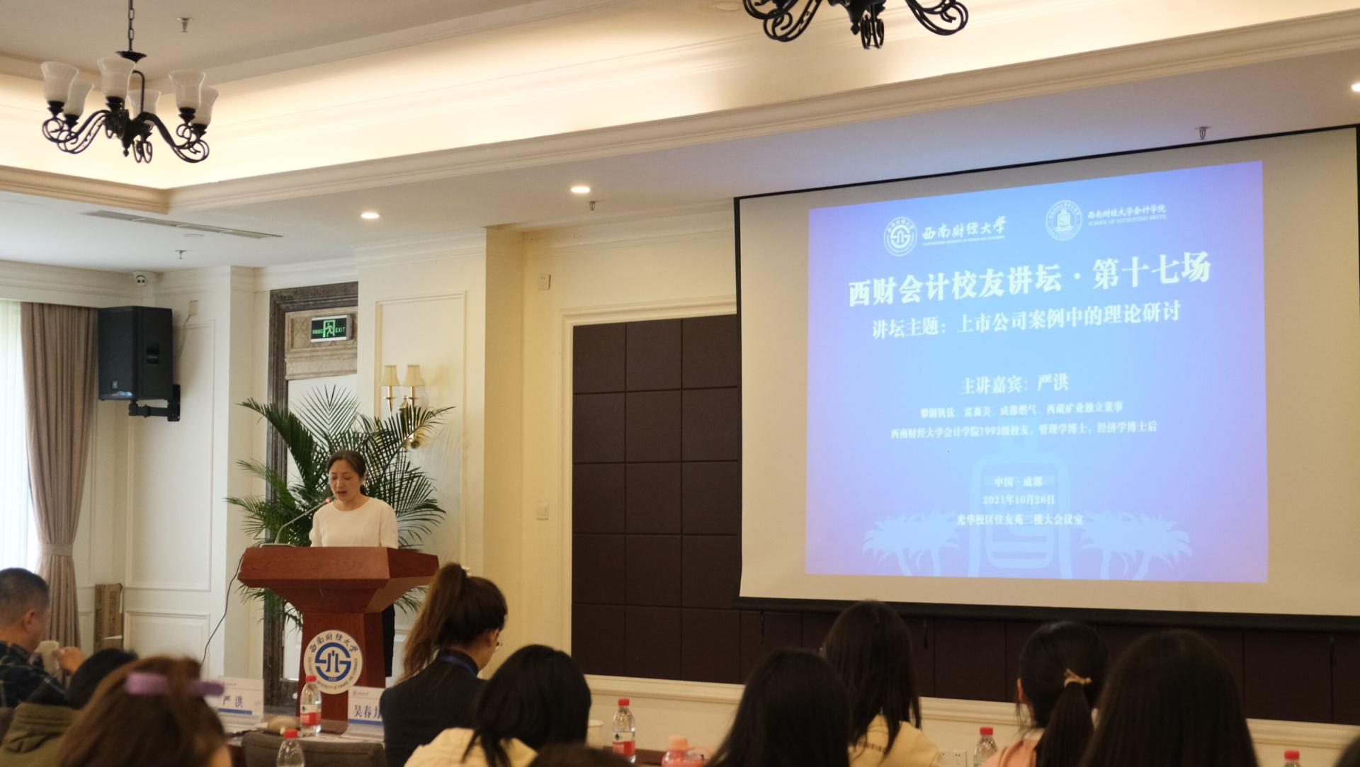 2021年10月26日下午,“西财会计校友讲坛·第十七场”在光华校区住友苑成功举办。学院邀请到本院1993级校友,管理学博士、经济学博士后,攀钢钒钛、富森美、成都燃气、西藏矿业独立董事严洪返校开展交流活动,采用线上视频会议直播线下讲座的形式,带来《上市公司案例中的理论研讨》的主题分享。yl1111永利集团会计学院分党委副书记吴春力、校友与外联办公室王慧老师、陈秋达老师和100多名会计学院学生参加了活动。