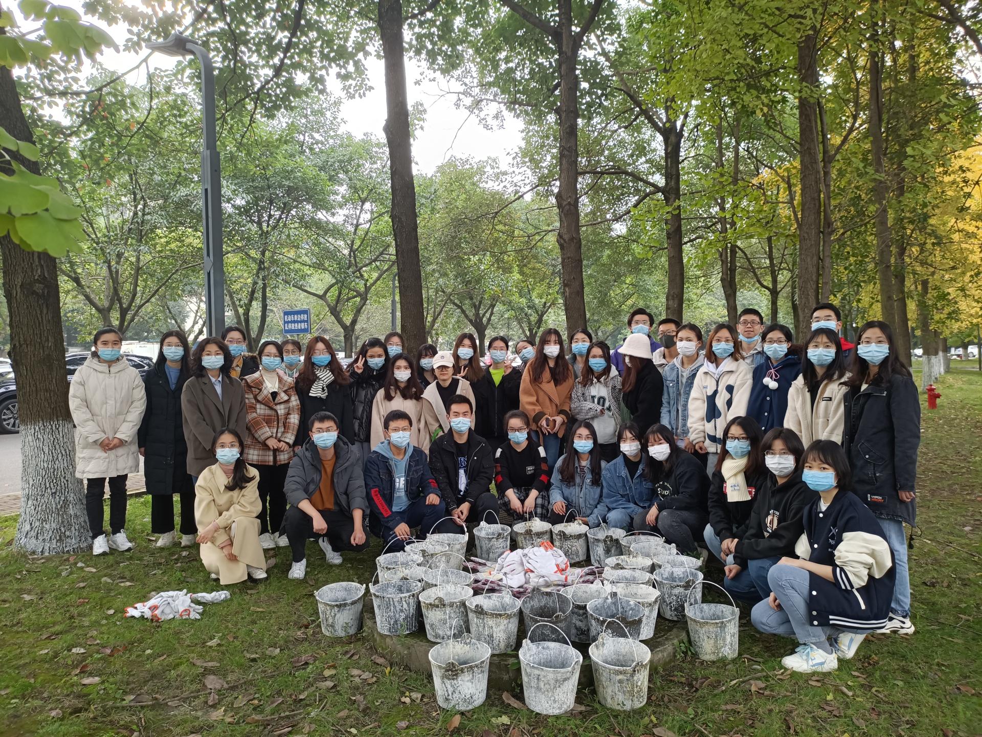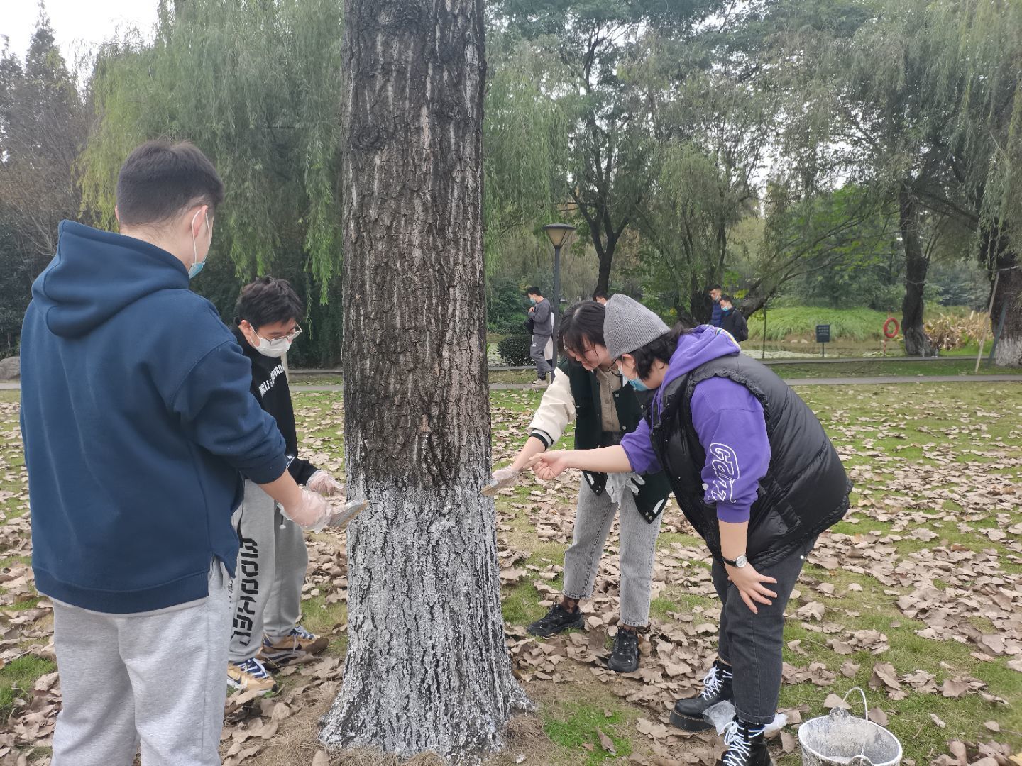 2021年11月19日上午,陈秋达老师带领2021级会计专硕三班学生在光华校区开展“树干涂白”冬季护树劳动实践活动。活动前,为达到整齐美观的涂白效果、起到良好的防病虫害作用,后勤工作人员向同学们讲解树干涂白方法及相关注意事项;同学们在专业人员现场指导下,将事先按照严格比例配置的涂白石灰,从根部对树进行均匀涂白,并在树皮缝隙、洞孔、树杈等处反复涂刷。劳动过程中气氛活跃,同学们不怕脏、不怕累,为校园树木穿上了御寒保暖、防虫杀菌的“保护衣”,在“树干涂白”活动结束后,同学们对涂白树木周边清扫整理,恢复了校园环境的干净整洁。