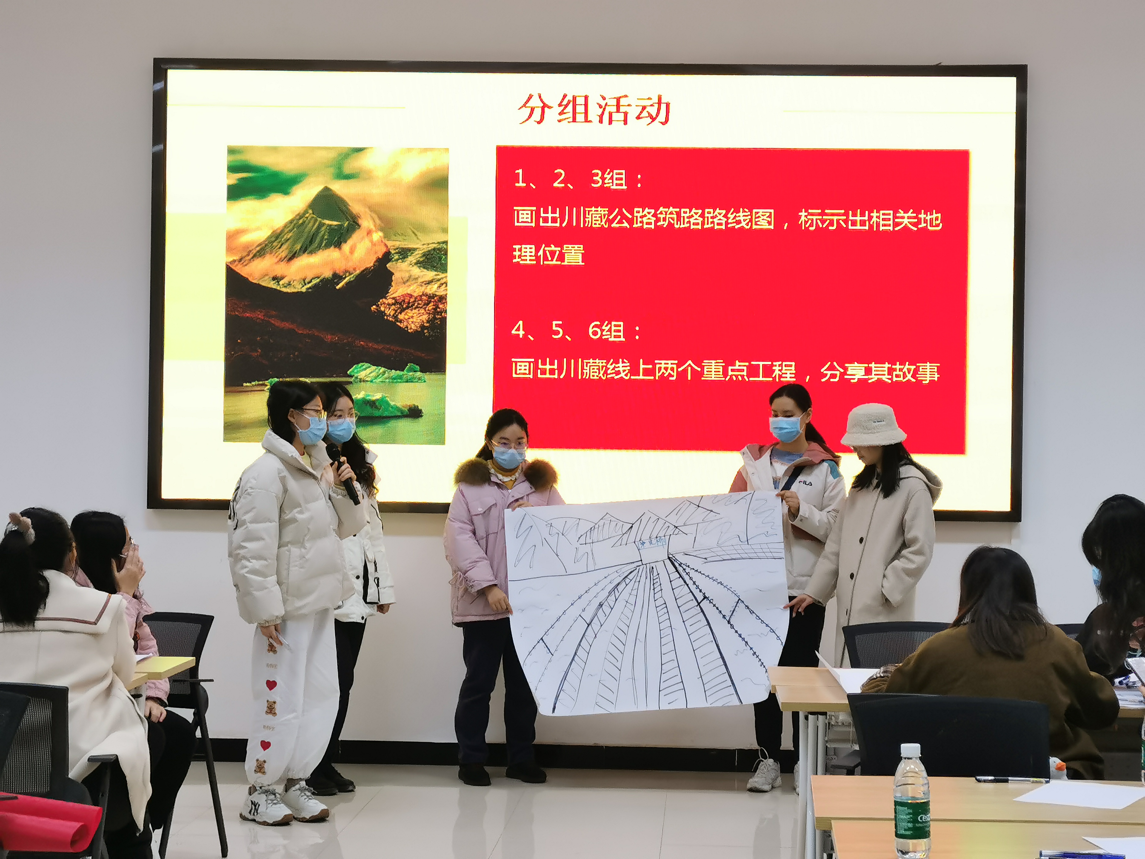 为帮助同学们深入了解川藏公路背后的故事,参观博物馆之后还设置了课堂环节,博物馆老师向我们详细介绍了与川藏公路有关的许多伟大人物事迹。老师向我们讲述了公路界的茅以升李昌源、鹰眼李鲁卿、鸽冰川的封印人齐树椿等在川藏公路建设中做出伟大贡献却默默无闻的伟大前辈们的奋斗故事,他们是干惊天动地事,做隐姓埋名人的典范。川藏公路作为中国最美景观大道,在政治上一条民族团结之路,在经济上是一条共同富裕之路,在军事上是一条国防安全之路,它是在世界屋脊上开掘出一条西藏与内陆的“血脉通道”,更是世界公路史上的奇迹“缔造者”。课堂的最后,同学们分组画图,将川藏公路筑路路线图、大渡河铁索桥、50年代修筑的飞仙关大桥、雅康高速大渡河大桥和二郎山隧道以简笔画的形式展示出来,并分享构图的思路以及这些工程的故事和伟大价值,对川藏公路的了解更深入,对“两路”精神也有新的体会。