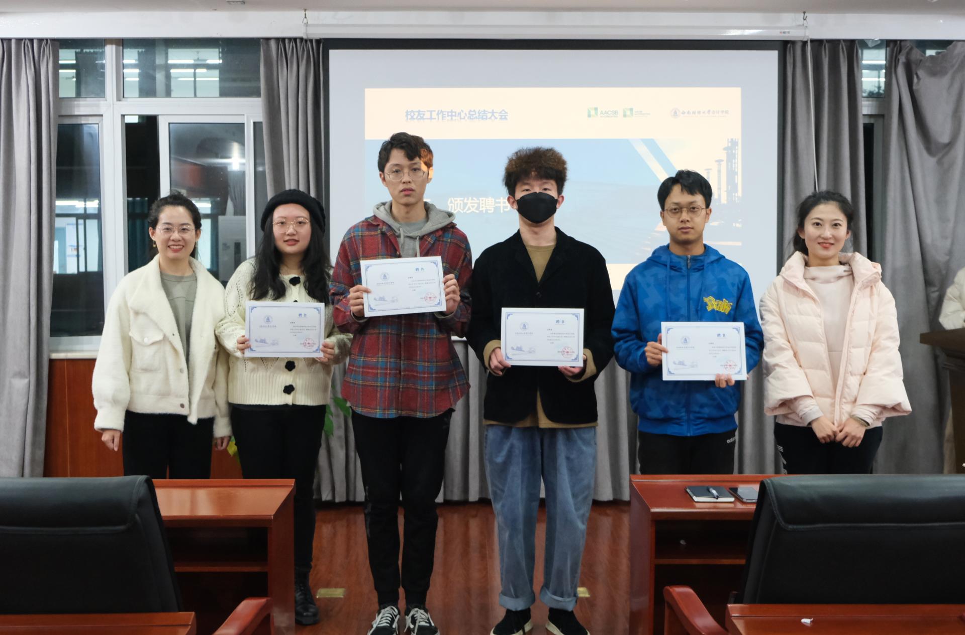 21:30,总结大会正式开始。首先是指导老师发言,会计学院校友工作中心指导老师王慧、陈秋达分别对本学期校友工作做了总结,提到本学期校友工作中心开展了丰富多样的校友活动、接待了来自不同年级和专业的数百位校友,获得了很好的反响;老师们对校友工作中心的工作给予了充分肯定,并提出对未来的期许。随后两位老师为校友工作中心的四位学生主任颁发了聘书并合影留念。接着四位主任为吴佳蔓等优秀部长、陈思源等优秀部员颁发了奖状和奖品并合影留念。然后,四位主任和获奖部长分别进行了发言,总结了本学期的工作和心得,分享了工作中的感动瞬间,并表达了对校友工作中心全体成员的美好祝愿。大家一致认为,校友工作中心是一个温暖的大家庭,给大家带来了幸福与温情。