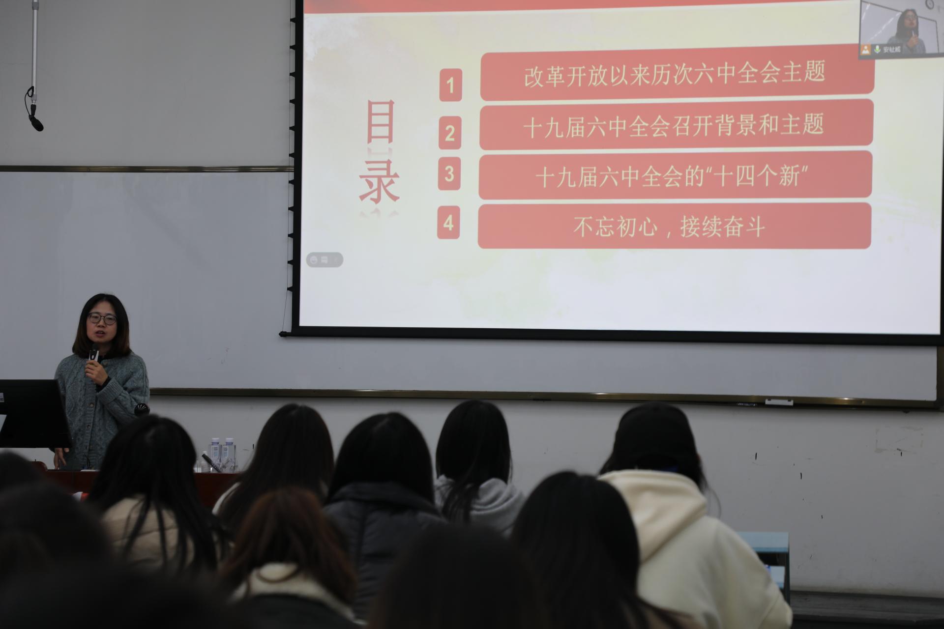秦慧对党的十九届六中全会公报全文内容进行系统讲解,从“十四个新”出发深入阐明会议精神内涵。她全面梳理了改革开放以来历次六中全会主题,几乎都是聚焦意识形态问题、党建问题,最终目标为实现中华民族的伟大复兴。她围绕本次会议召开背景及内容回顾了党的百年奋斗历程中取得的重大成果和历史经验,激励同学们坚定信念、接续奋斗。她指出,在这个比历史上任何时候都更接近、更有信心和能力实现中华民族伟大复兴的目标的时期,全党必须永远保持同人民群众的血肉联系,必须铭记生于忧患、死于安乐,常怀远虑、居安思危,必须抓好后继有人这个根本大计,在新时代新征程赢得更大的胜利和荣光。