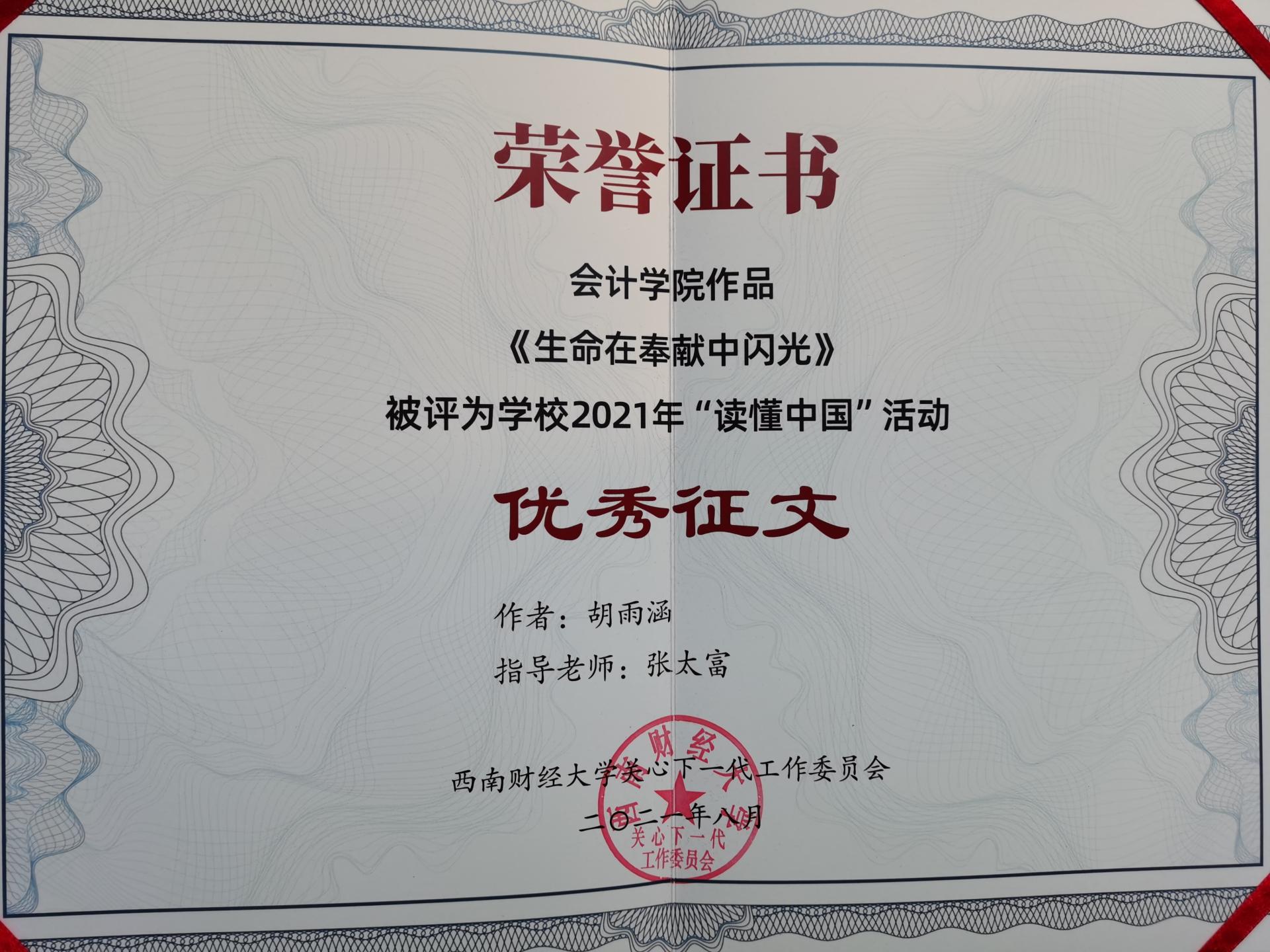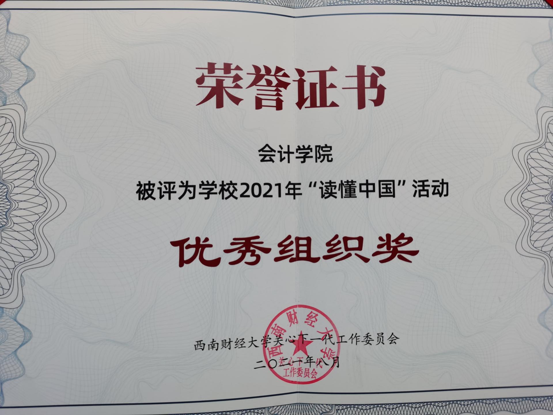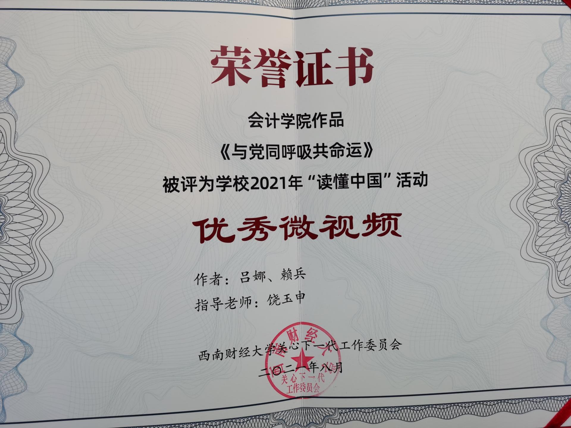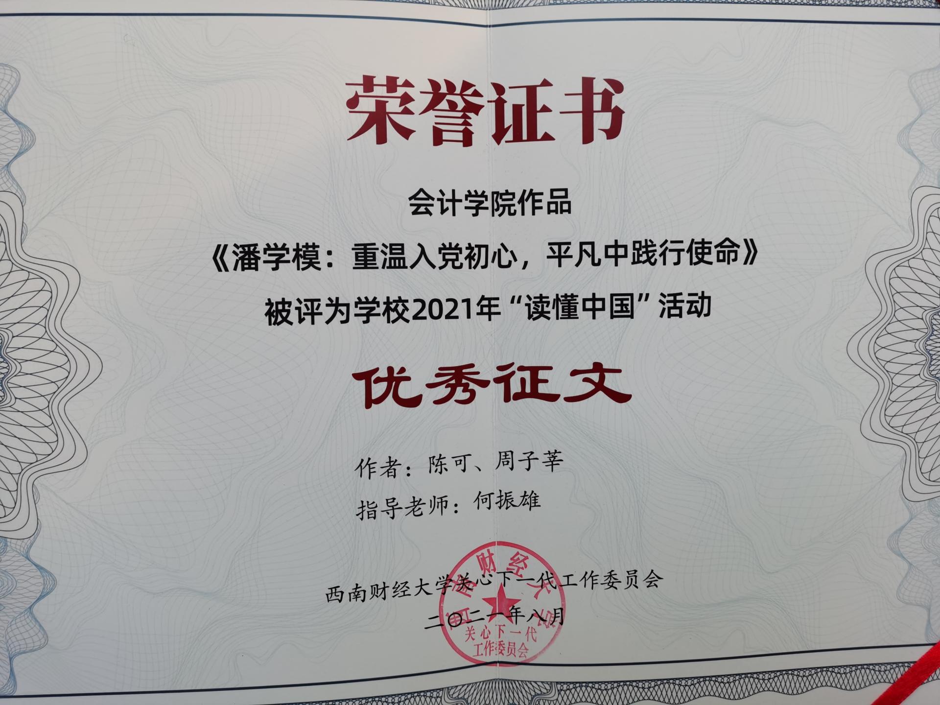 2021年正值中国共产党成立100周年,为弘扬“五老”精神,树立先进典型,进一步激励从事关爱事业的教育系统广大"五老"践行初心使命,主动作为,推动教育系统关心下一代事业持续创新发展,根据教育部关工委《关于开展2021年“读懂中国”活动的通知》,我校2021年开展了“读懂中国”活动,我院关工委积极踊跃组织师生参与。在yl1111永利集团关工委举行2021年表彰中,学院关工委获2021年学校关工委“读懂中国”系列活动优秀组织奖,学院学生作品《与党同呼吸共命运》获获2021年学校关工委“读懂中国”系列活动优秀微视频奖,学院学生作品《生命在奉献中闪光》《潘学模:重温入党初心,平凡中践行使命》获获2021年学校关工委“读懂中国”系列活动优秀征文奖。