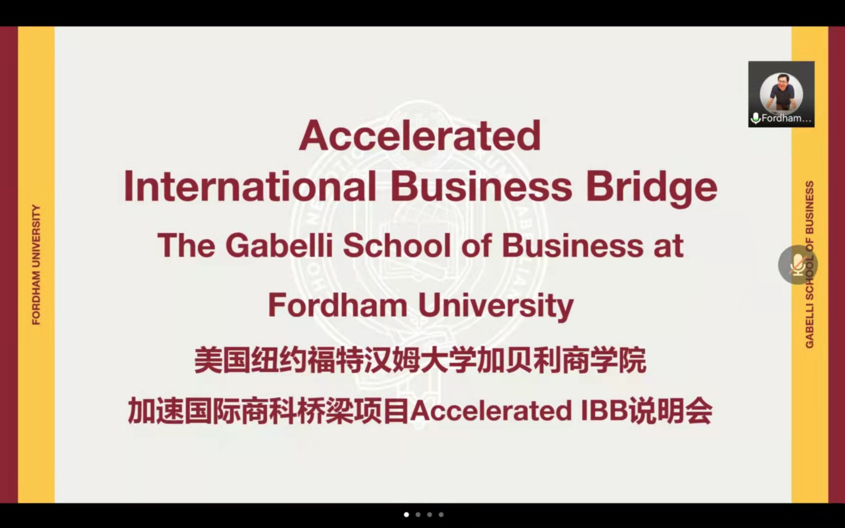 最后一位分享的是美国福特汉姆大学加贝利商学院大中华地区主任Chris Gao。高老师重点分享了福特汉姆大学优秀的地理优势——位于金融中心纽约市曼哈顿,紧邻中央公园,百老汇,华尔街等,并且具有突出的学科优势和校友优势,此外着重介绍了加速国际商科桥梁项目Accelerated IBB,为会计学院的同学们提供了更加便捷地进入美国纽约福特汉姆大学学习的机会。同时,高老师也向同学们说明了录取要求以及申请项目的具体安排和时间节点,向有意申请海外硕士项目的西财学子发出了邀请。