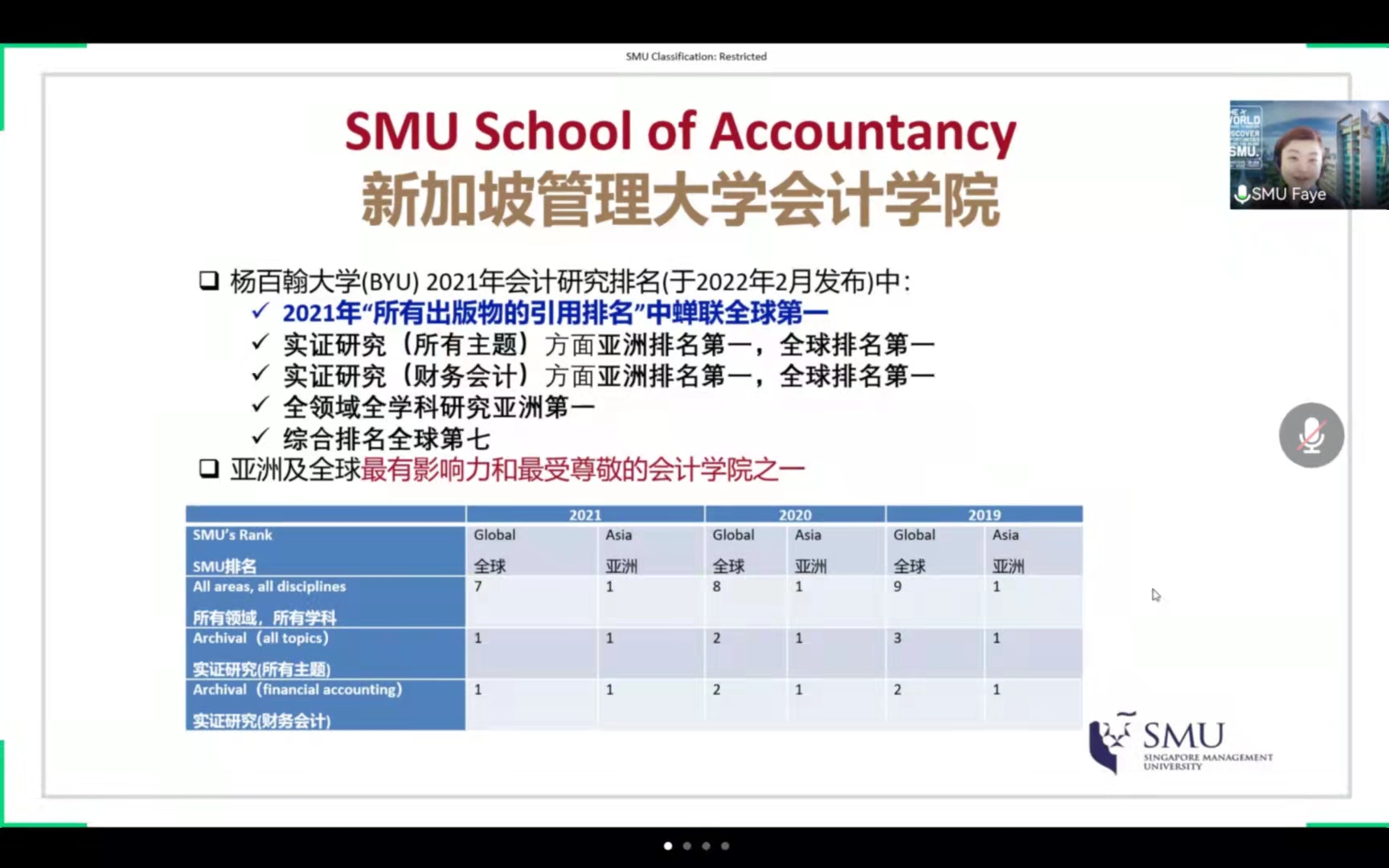 第二场由新加坡管理大学的主讲人乔老师进行分享,乔老师从专业会计硕士(MPA)和财务大数据分析硕士(MSA)两个专硕项目的介绍和申请细节两大板块展开讲解。首先,乔老师从项目优势、课程结构、就业现状三个方面介绍了专业会计硕士项目。其中,她重点突出了专业会计硕士项目的最大亮点,即能够帮助学生提供一条快捷但扎实的从业通道并且其文凭已经受到全球11家专业会计机构和商学教育质量认证机构的认证。接下来,乔老师通过与专业会计硕士项目比较来讲解财务大数据分析硕士项目。在课程结构方面,财务大数据分析硕士课程需要一定的会计学习背景,并且融入了数据技术类的“硬核”课程,更能适应新时代下的会计变革。最后,乔老师介绍了申请流程并引入了优秀校友的学习感想,并表示希望收到更多优秀西财学子的申请。
