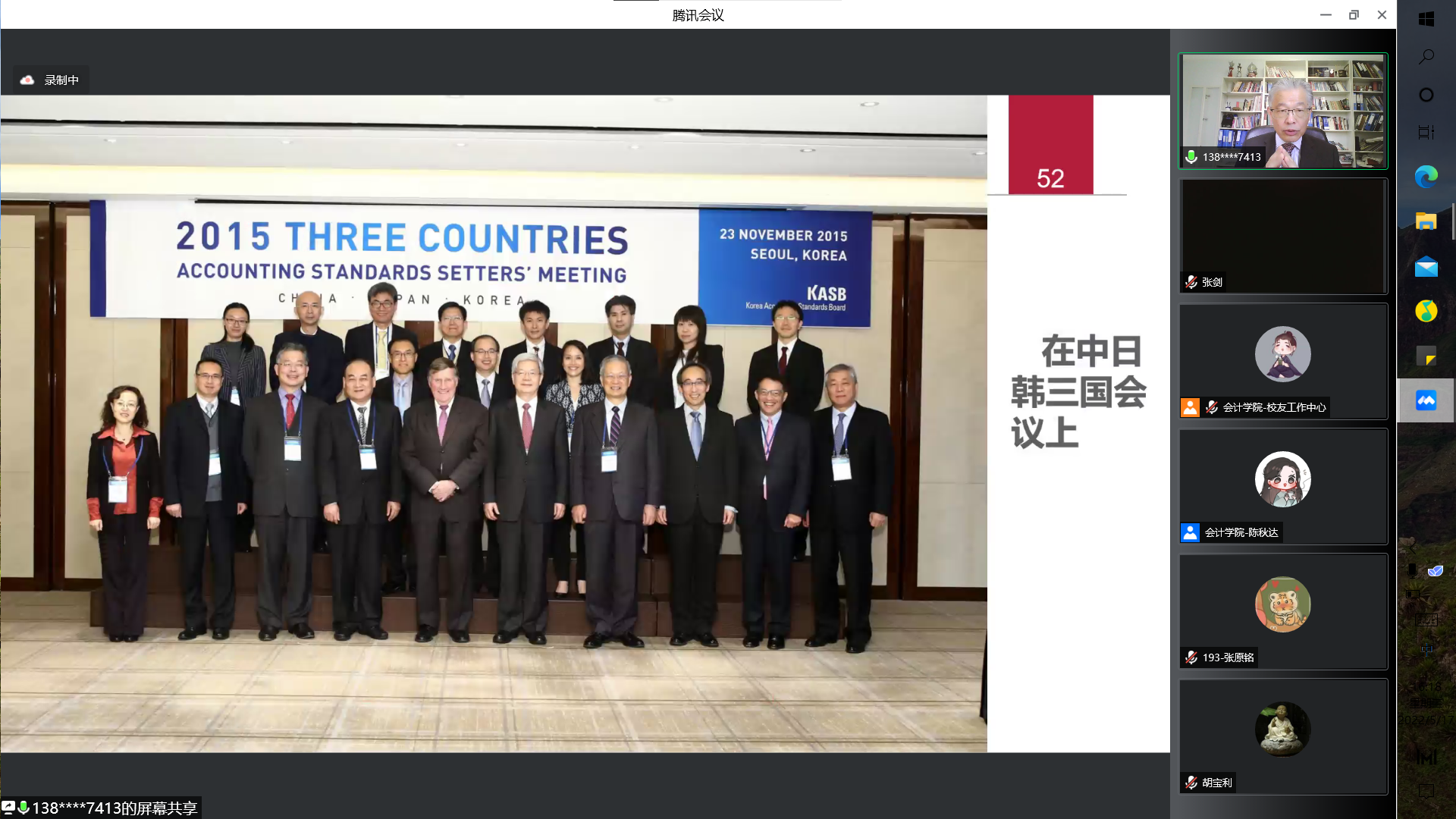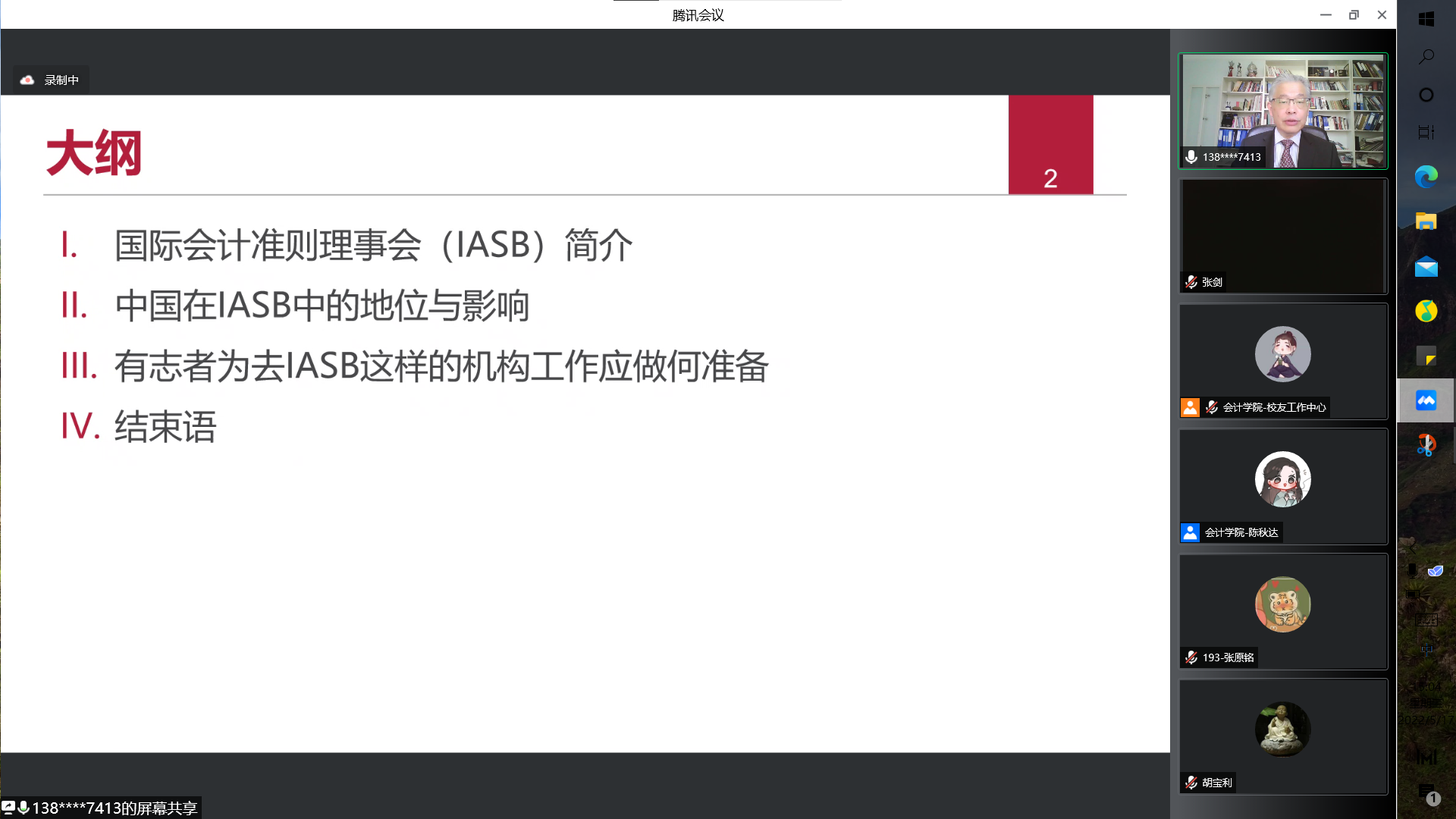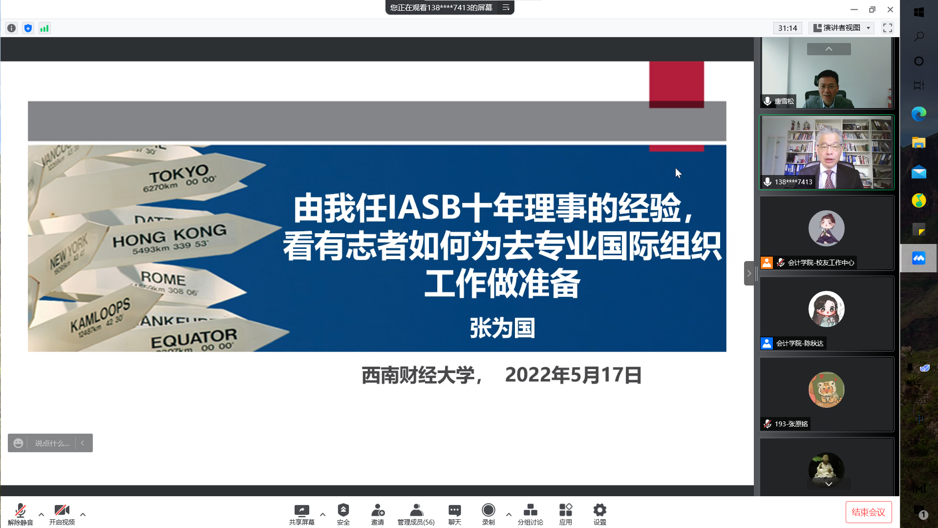 为进一步拓宽学生国际视野,强化学生对国际组织的认识,鼓励学生勇于参加国际组织的实习与工作,同时也积极响应疫情防控;在2022年5月17日15:00,光华讲坛暨“咖咖来了,‘会’点赞”第十七期--《由我在IASB工作经验看如何为去国际组织工作做好准备》 主题讲座,在腾讯会议平台顺利开展,200余名师生参与此活动,讲座由国际会计准则理事会理事张为国教授主讲,由会计学院副院长唐雪松教授主持。