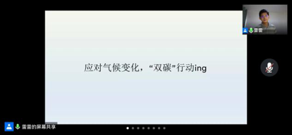 会议上,雷雷老师由气候变化引出话题,首先介绍了气候变化对环境、经济造成的影响,而后从“适应”和“减缓”这两个方面说明了应对气候变化的多项措施,并指出国际上各国需要共同行动,合作减排、坚持“共同但有区别的责任”原则。紧接着,雷雷老师向我们详细介绍了中国的减排目标——实现“碳达峰”与“碳中和”,同时也分别从企业、政府、投资者这三个群体的角度阐述了碳减排的具体行动和其中面临的风险和机遇,强调了三方相互影响、相互激励的密切关系。最后是学科相关的气候变化研究展望,雷雷老师从会计、金融、碳管理等学科的角度,分析了未来财经行业面临的挑战、职业发展的前景、和对新型人才的能力要求,让我们了解到在当今世界碳减排的背景下,我们作为财经院校的学生该具备哪些素质和能力为此贡献绵薄之力。