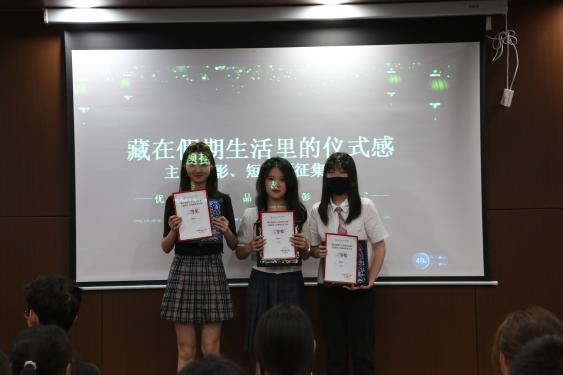 经过假期期间同学们的踊跃投稿以及线上的大众投票评比,共有10名同学在本次摄影与短视频征集活动中脱颖而出。随着主持人的宣布,新媒体中心主任为选手们颁发了奖状以及奖品,并进行拍照留念。颁奖仪式顺利结束。