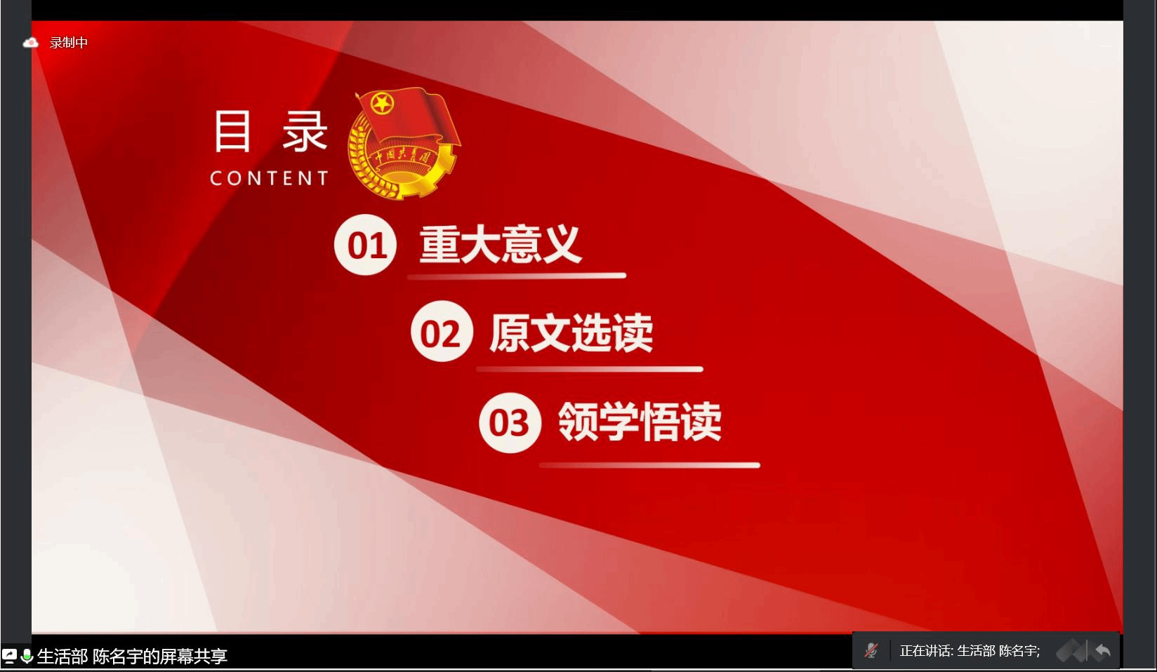 会议共三个环节。首先,团学代表何沁峰同学阐述了《论党的青年工作》的重要意义——该著作提供了新时代党的青年工作的最权威教材,为全党全社会深入学习贯彻习近平总书记关于青年工作的重要思想提供了根本遵循。这部著作饱含着习近平总书记对党的青年工作的高度重视,是全国广大团员青年和青年工作者在共青团成立一百周年之际收到的珍贵礼物。要深刻学习领会《论党的青年工作》的丰富内涵,深刻认识党对青年工作规律认识的新高度,切实增强贯彻落实的自觉性。