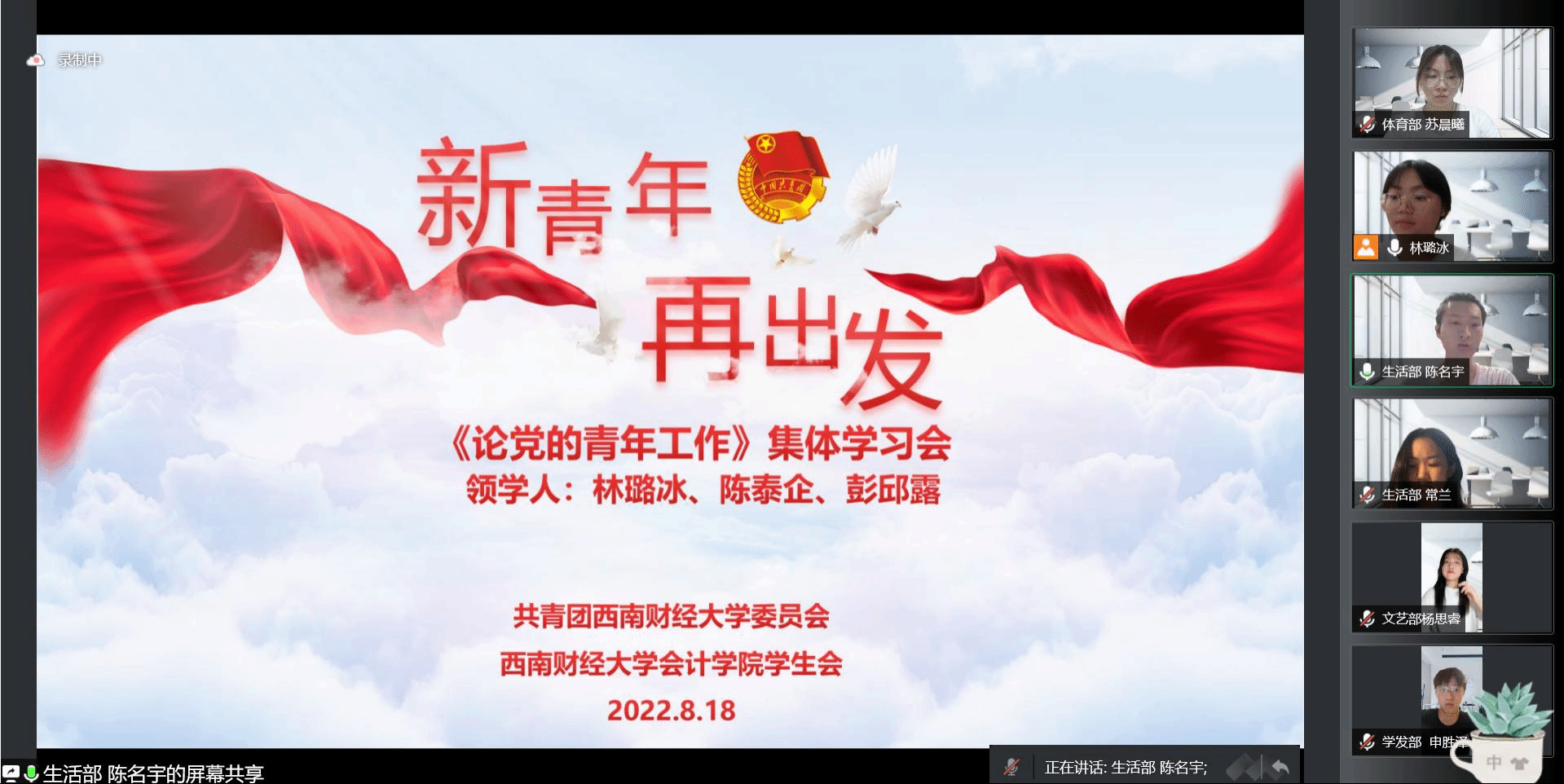 为全面贯彻习近平新时代中国特色社会主义思想,坚持党的全面领导,深度学习习近平总书记关于青年工作的重要思想,积极响应在全校部署开展“喜迎二十大、永远跟党走、奋进新征程”主题教育活动,团结引领广大青年学生坚定跟党走、建功新时代,以昂扬奋进的青春之姿迎接党的二十大胜利召开,yl1111永利集团会计学院团委学生会组织于8月18日晚组织召开了《论党的青年工作》专题视频学习会。会计学院团委学生会、校友工作中心和新媒体中心各部门代表分别交流发言,会议由团学生活部陈名宇主持。