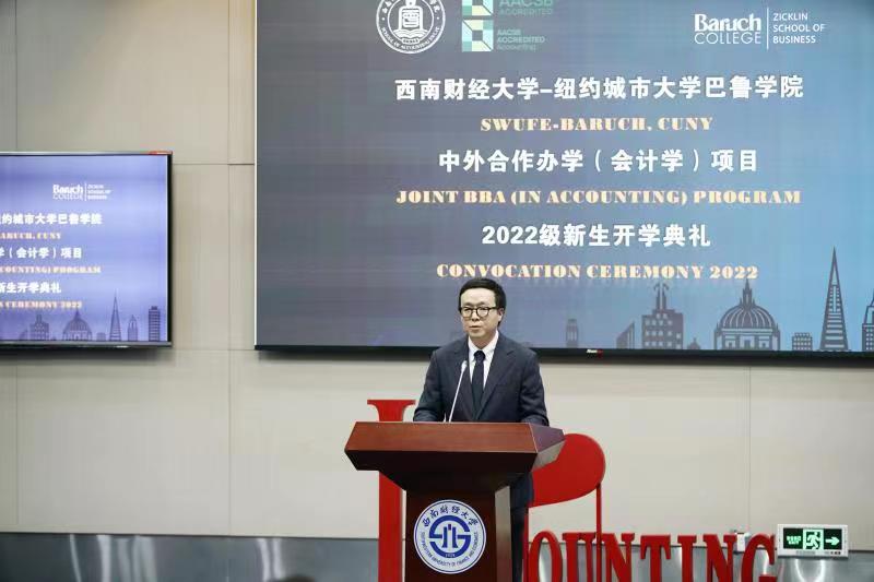 典礼上,梁婷部长、王新处长、廖春华副处长分别致辞,引导同学们有效地利用西财和巴鲁的资源,提高通识素养与专业能力,做好长远的大学学业与生涯规划,通过大学四年的学习与实践,在开放合作的体系中培养国际视野与家国情怀,成为具有社会责任感和创新精神的新时代青年。会计学院党委书记刘晓彬介绍了西财—巴鲁项目从过往到现在的传承,鼓励同学们发挥优势特长,在新的起点保持自立自强,以青春力量为中华民族的伟大复兴“绽放绚丽之花”,在不确定的世界中拥有梦想,找到人生的方向。在新生教育部分,易阳副院长致新生寄语,代表学院衷心的祝贺和欢迎新同学的加入,鼓励2022级学子保持理想、不怕吃苦、直面困难,在yl1111永利集团会计学院大家庭里努力学习和奋斗、不负韶华。