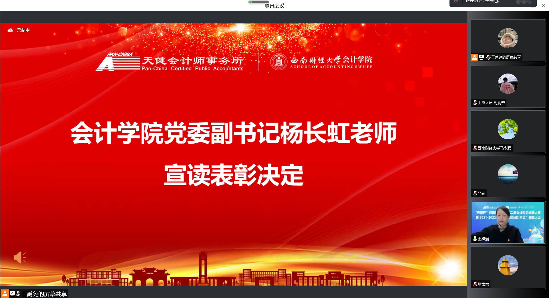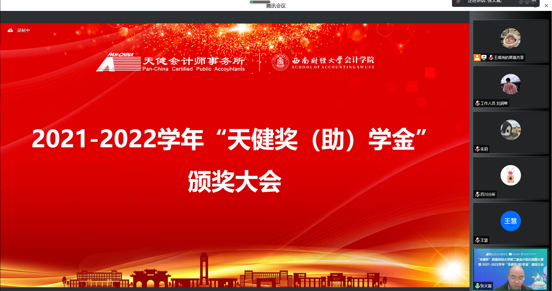12月6日下午,2021-2022学年“天健奖(助)学金”颁奖大会于线上会议隆重举行。天健会计师事务所四川分所总经理阮响华、天健会计师事务所四川分所人力资源部经理马莉,每日经济新闻编委、成都天赋文创金融科技公司执行董事官远星、每日经济新闻商学院频道主编梁宏亮,及会计学院会计学院院长马永强、党委书记刘晓彬、党委副书记杨长虹等学院领导和相关老师出席本次会议。典礼由会计学院党委副书记张太富主持。