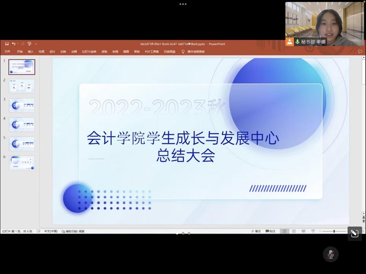 12月15日晚,会计学院学生成长与发展中心2022-2023学年第一学期线上总结大会顺利举行,学生成长与发展中心全体成员参加了此次会议。本次总结会议由秘书部申娜同学主持。