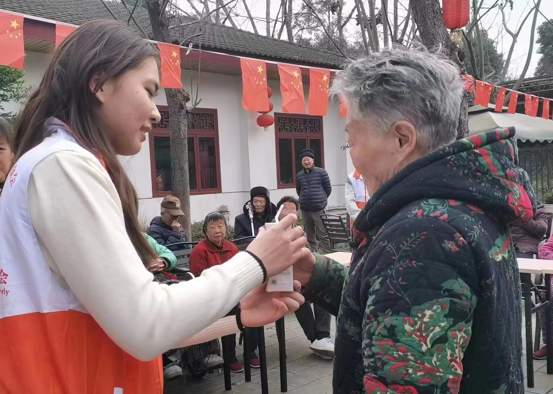 在活动过程中,志愿者们与抗战老兵进行了亲切交谈,为他们送去了芝麻糊、牛奶等健康食品,同时为老兵们表演了精心准备的手势舞,并科普了春季高发疾病的预防小知识。更特别的是,在三八妇女节到来之际,志愿者们为养老院里的婆婆都送上了一支康乃馨,给她们带去了温暖与关爱。