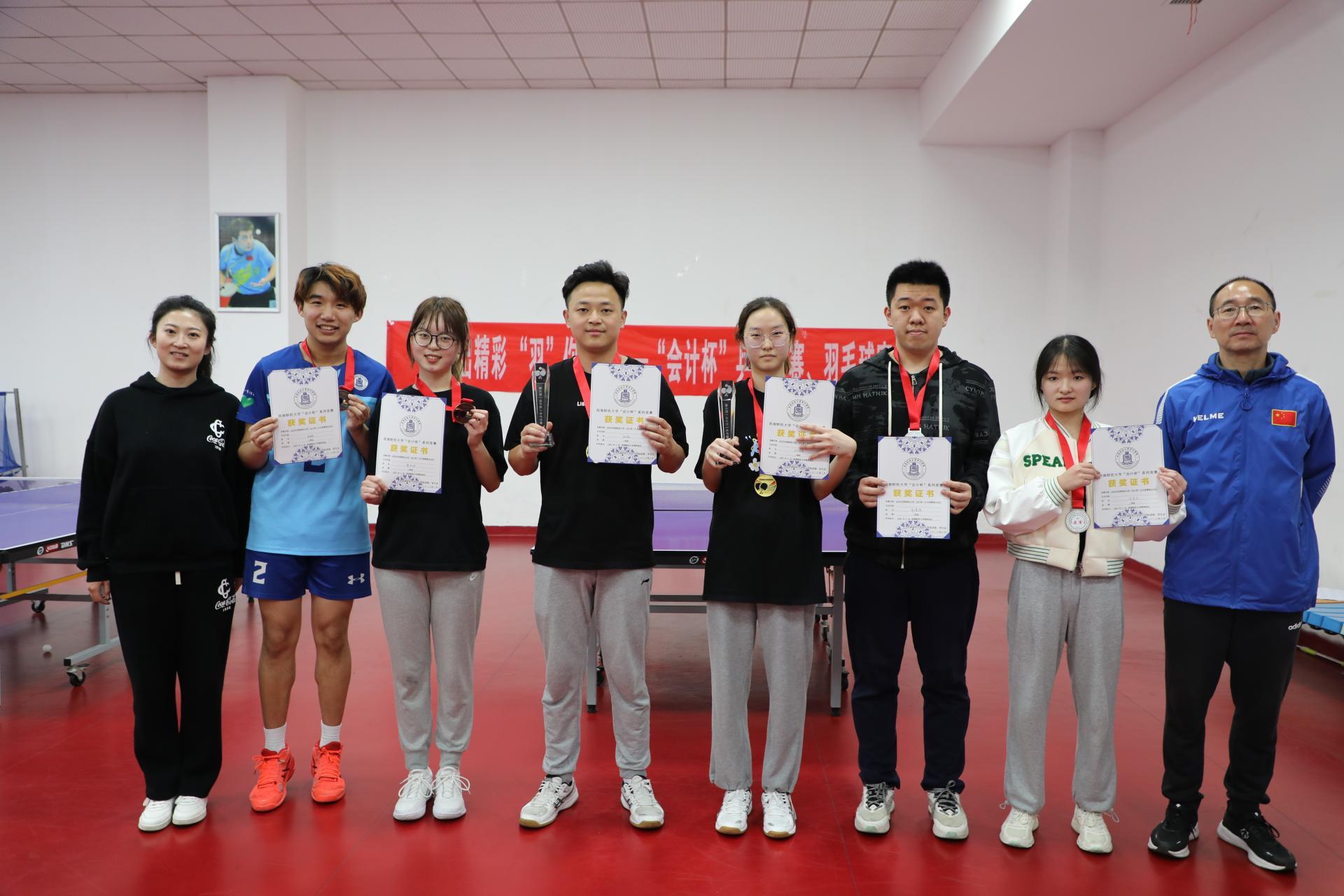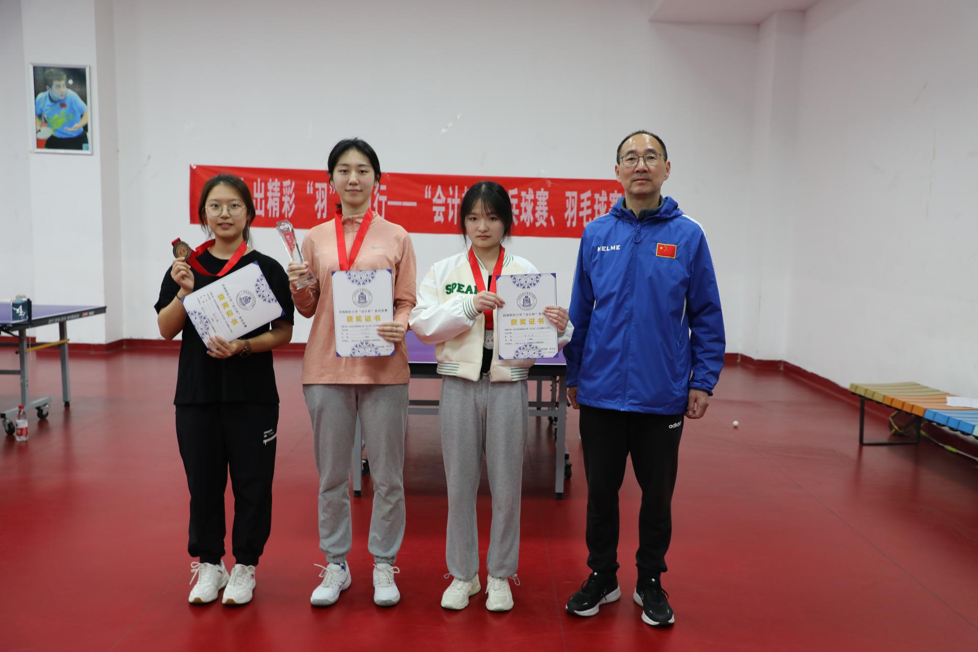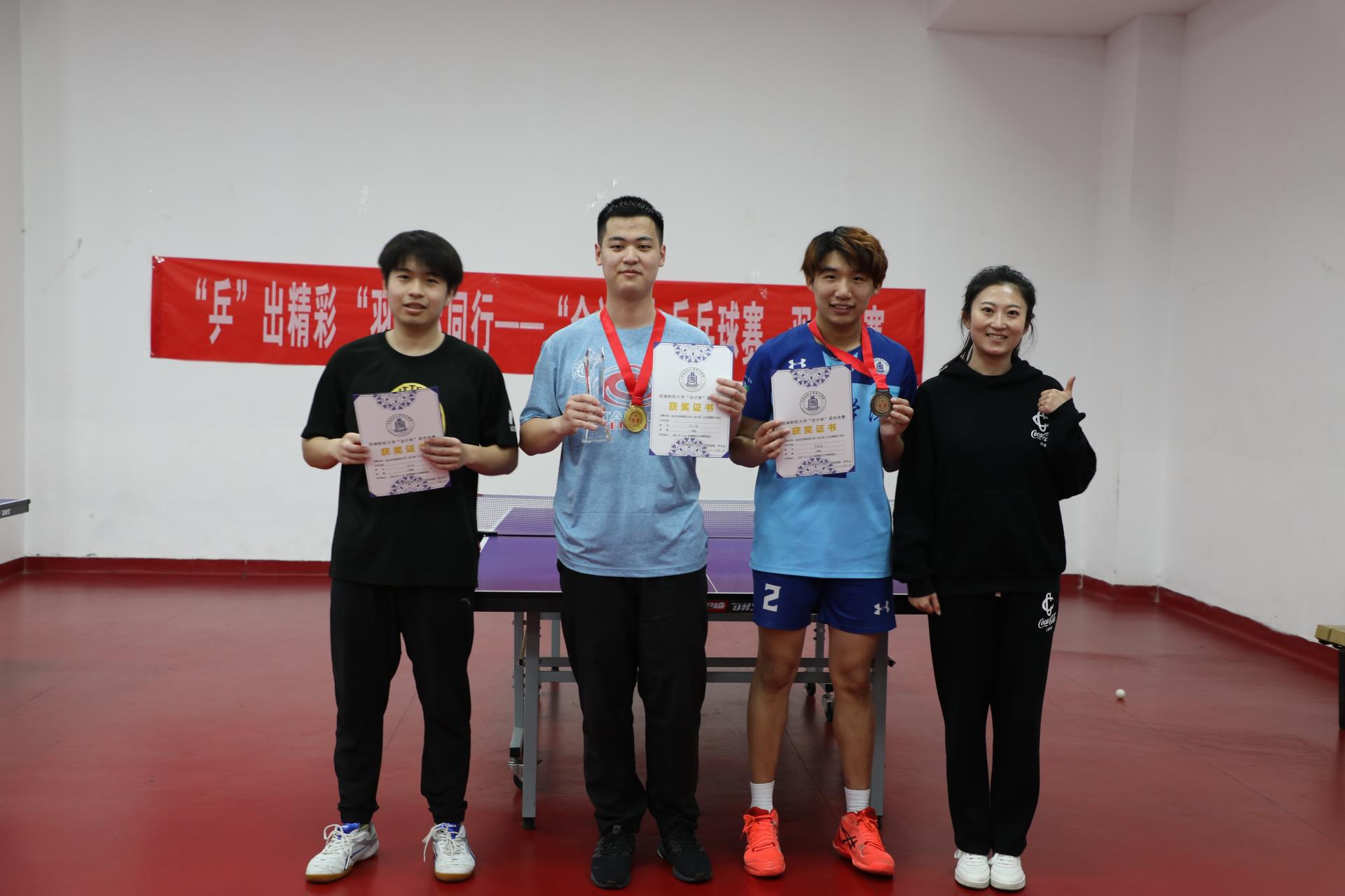 最后,在体育馆举行了颁奖仪式,会计学院党委书记刘晓彬老师、团委书记王慧老师为获奖运动员颁奖。本次比赛为会计学院乒乓球爱好者们提供了一个相互交流的平台,更拉近了学院师生之间的距离。期待来年在“会计杯”乒乓球赛的现场看到会计师生们更多精彩的表现。