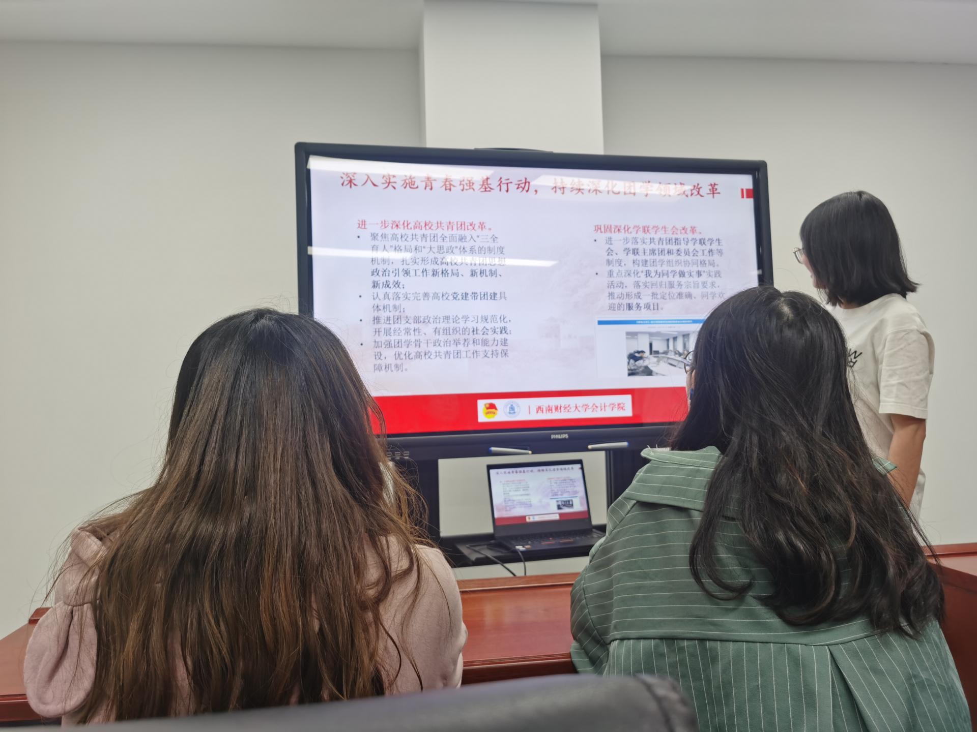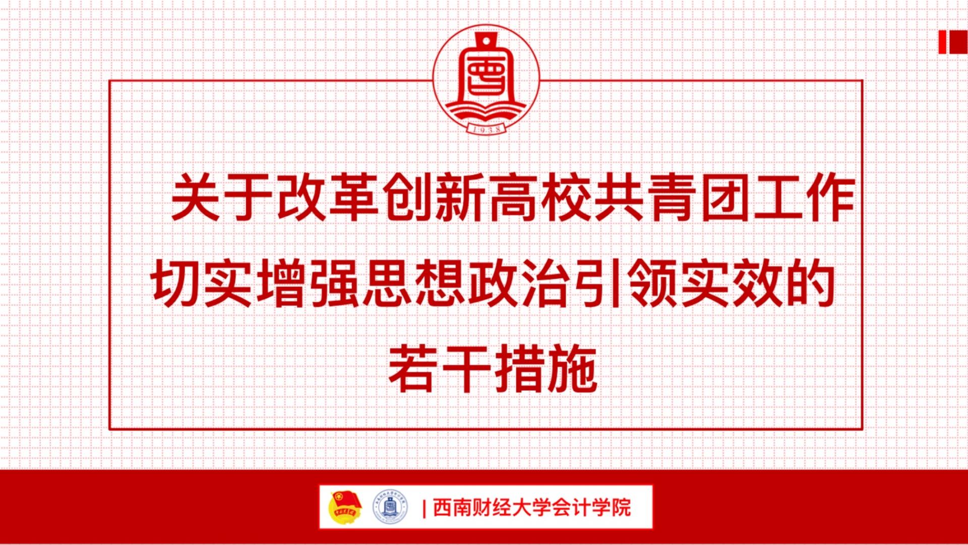 团委书记王慧领学《关于改革创新高校共青团工作切实增强思想政治引领实效的若干措施》、《共青团指导学生联合会工作的若干规定》、《2023年四川学校共青团工作要点》以及《共青团yl1111永利集团委员会2023年工作要点》等系列文件。她指出,学院共青团要始终围绕中心、服务大局,引领学院各级团学组织和团学骨干紧跟学校推进“双一流”建设,紧扣新财经主题,要在“大思政”和“三全育人”的大格局中切实担负起团组织的政治责任和职责使命,发挥好政治功能,做到“党有号召,团有行动”,落实共青团工作要点,扎实形成学院共青团思想政治引领工作新格局、新机制、新成效。