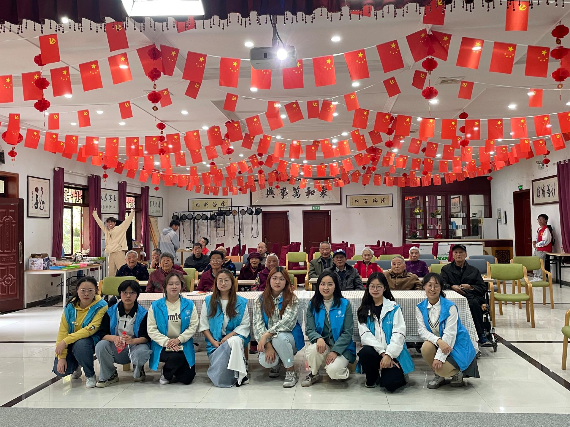 志愿者们为老人们分发牛奶、芝麻糊、水果等慰问礼物,陪老人们聊天、散步、下象棋。活动中,志愿者们集中在多功能厅一起给老人们带去歌曲串烧表演,《我和我的祖国》与《在希望的田野上》等红色歌曲引发现场热烈反响,志愿者和老人们于高潮部分积极互动、热情合唱。表演完毕,老人们有感而发,向志愿者们讲述那段艰苦岁月,现场氛围其乐融融。