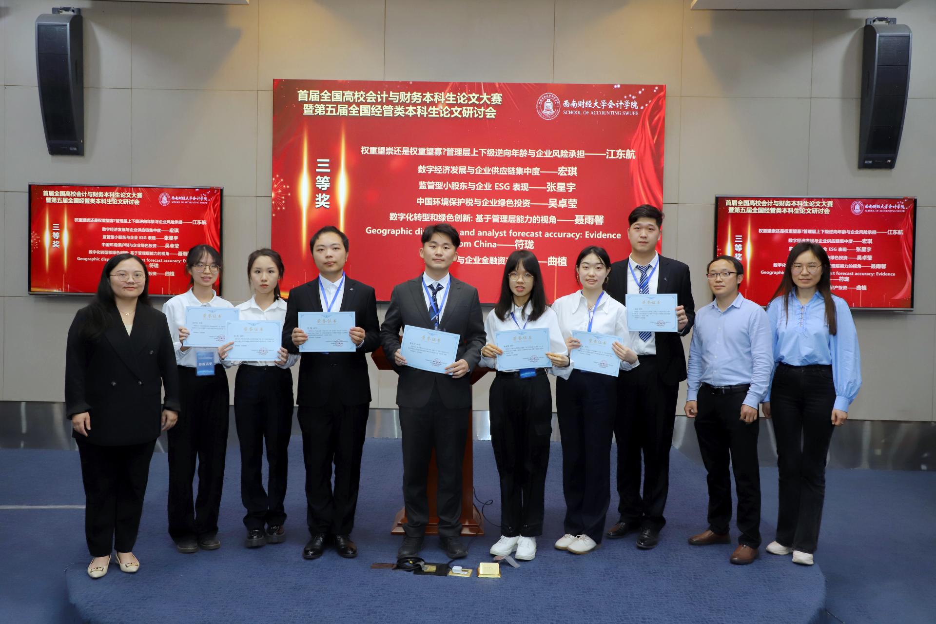 至此,首届全国高校会计与财务本科生论文大赛暨第五届经管类本科生论文研讨会圆满落幕。此次大赛不仅促进了高校会计与财务本科生适应中国经济社会发展需要,将研究根植于中国制度背景下的会计与财务问题,体现了yl1111永利集团会计学院“贡献财会新知,培养商界精英,推动社会进步,践行价值传承”的使命担当,还彰显了我校对积极探索时代新人培育路径与落实机制,深化“新财经”人才和经济学拔尖人才培养改革创新,加强数字财经课程和教材建设,深化产教融合,推进高端应用型人才培养模式改革,推动高等财经教育产业链、创新链、人才链融合发展协同创新等方面主要情况和重点问题的深刻思考和生动实践。