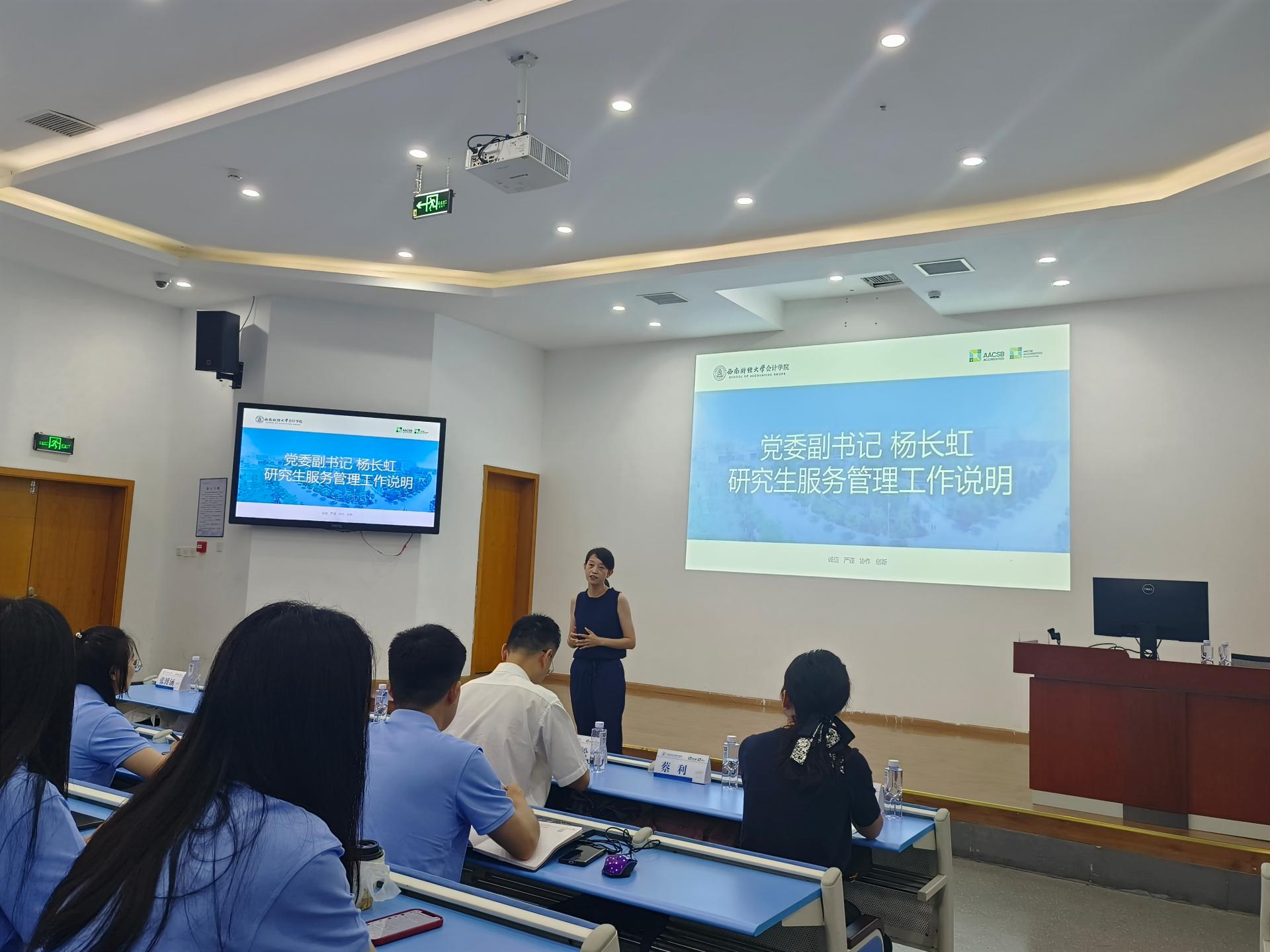 随后,副院长唐雪松教授从研究生阶段学习特征、导师选择、中期考核等方面就研究生人才培养工作进行了重点说明。党委副书记杨长虹以三个“重要”对安全问题、人际沟通、生活服务等方面对研究生服务管理工作进行了提醒说明。专业学位教育中心主任邓博夫随后介绍了项目概况,并表达学院对项目的支持和期待。最后,王旭老师对研究生培养环节作了细致讲解。