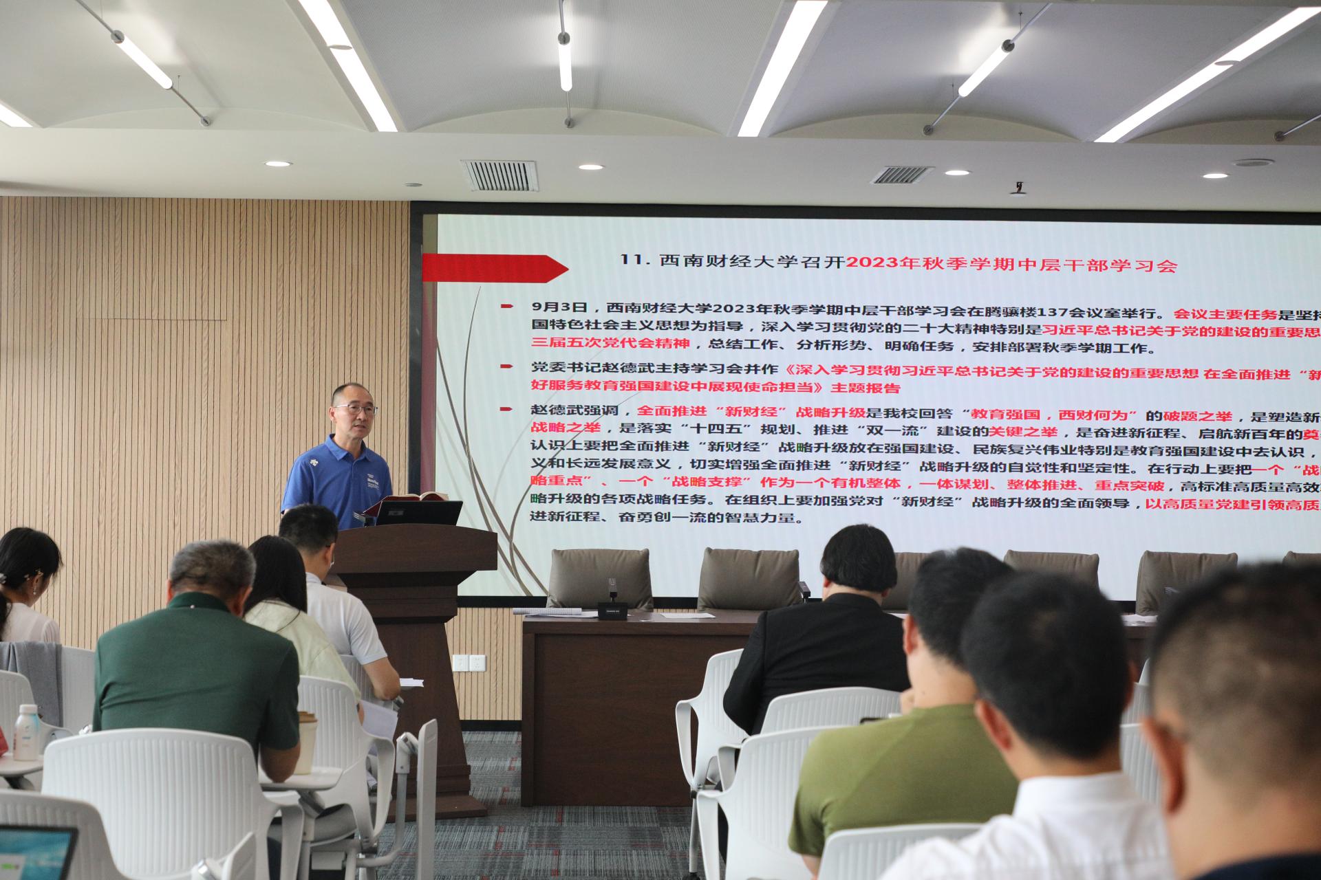 院长马永强就学习贯彻学校秋季学期中层干部学习会会议精神再次强调,全院教师要坚持不懈用习近平新时代中国特色社会主义思想凝心铸魂,深入学习理解学校“新财经”战略升级的重大意义和广泛内涵,要提振精神,深入思考职业发展规划,充分运用学校学科建设、人才人事改革、创新平台建设、专业布局优化调整的发展机遇,弘扬教育家精神,牢记为党育人、为国育才的初心使命,自信自强、踔厉奋发,以全面推进“新财经”战略升级为牵引、为教育强国做出更大贡献。