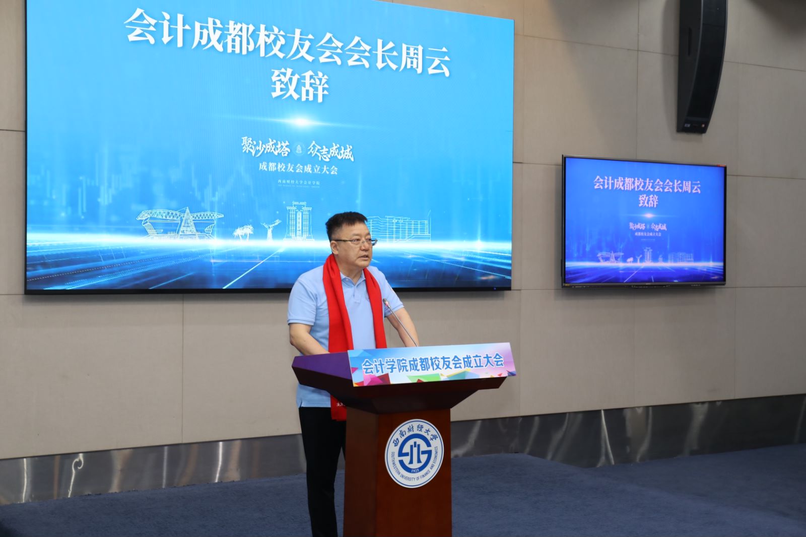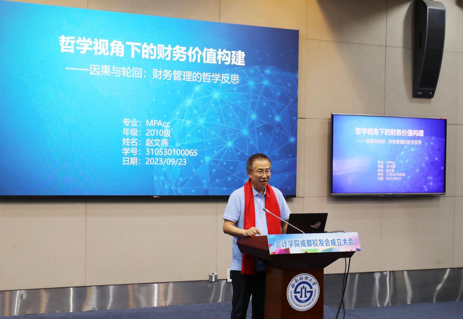 首任会长、86级会计专业校友周云代表会计学院成都校友会理事会发言。他表示,毕业以来,目睹了学院的成都校友群体逐步发展壮大,校友们分布在政府、金融、互联网等各个领域,也感受到学院的繁荣发展。首届理事会将提高政治站位,坚持守正创新,在学校学院的带动下,积极组织校友活动,不断增强校友凝聚力和归属感,更好地促进地区社会经济文化发展,更好地促进校友自身职业发展,以校友群体社会贡献促进母校母院发展,为以中国式现代化全面推进中华民族伟大复兴贡献所有“会计人”的力量。