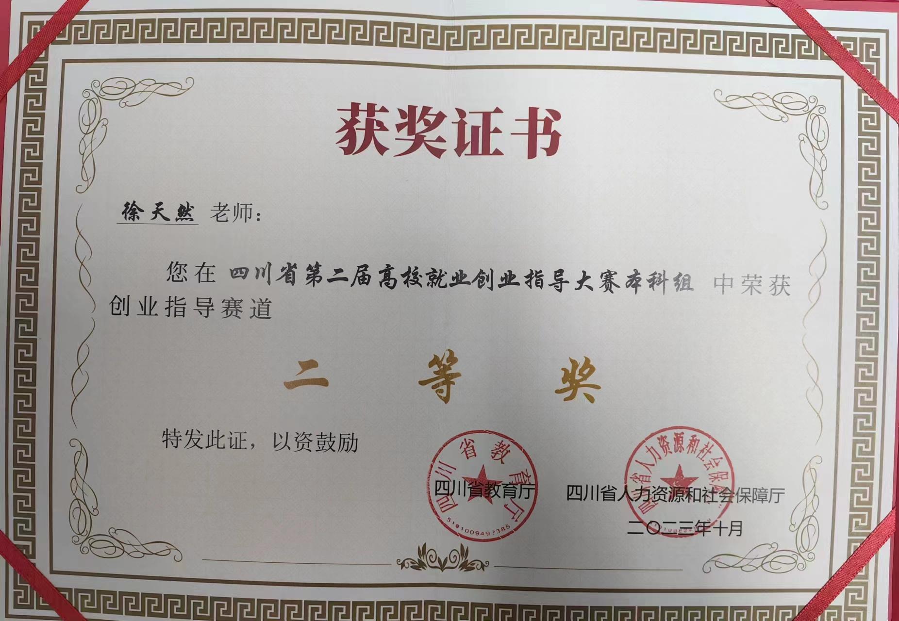 近日,我院辅导员王慧老师、徐天然老师分别荣获四川省第二届高校就业创业指导大赛特等奖与二等奖。