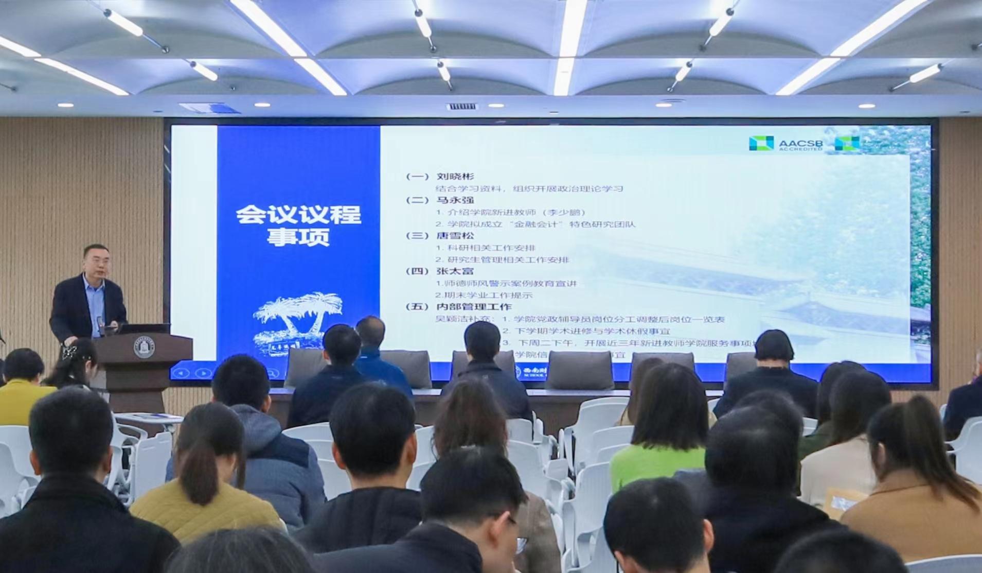 学院纪委书记、党委副书记张太富作师德师风案例警示教育宣讲。副院长唐雪松、副书记张太富就分管工作相关事宜进行安排,院长助理吴颖洁就内部管理工作具体事宜进行解读。