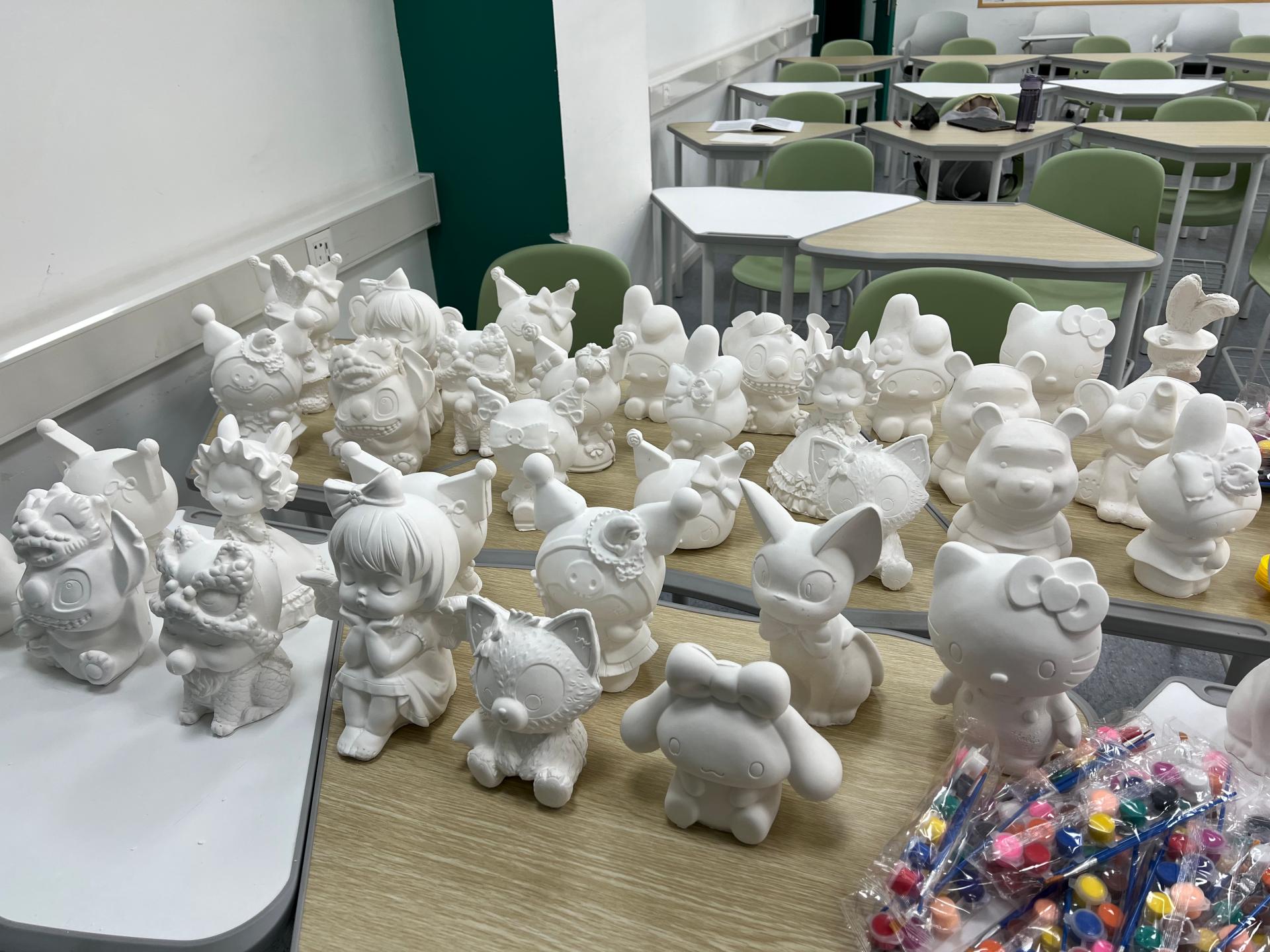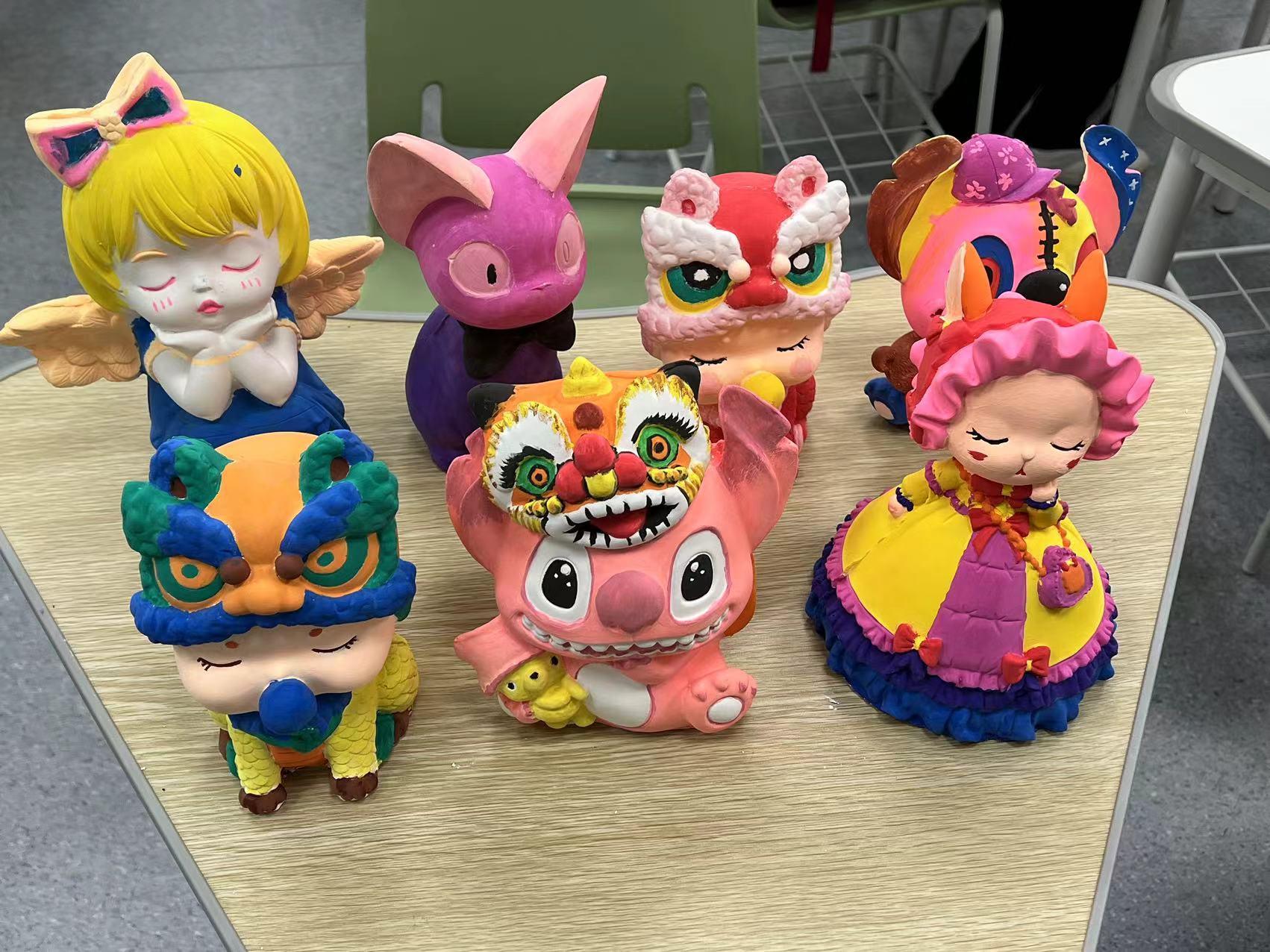 在活动过程中,同学们精心调色,依凭自己的想法落笔,赋予每个娃娃不同的灵魂。从调色、描绘到整体成型的过程,同学们感知了色彩世界梦幻般的千变万化,在实践中潜移默化地增强了对色彩的认识,提高了动手能力、想象能力与思考能力。自由的绘制过程为作品提供更多可能。同学们用画笔和颜料,发挥自己的想象,在各种造型的卡通石膏像上绘画出了属于自己的颜色,就像在生活中每个人都有属于自己的颜色。