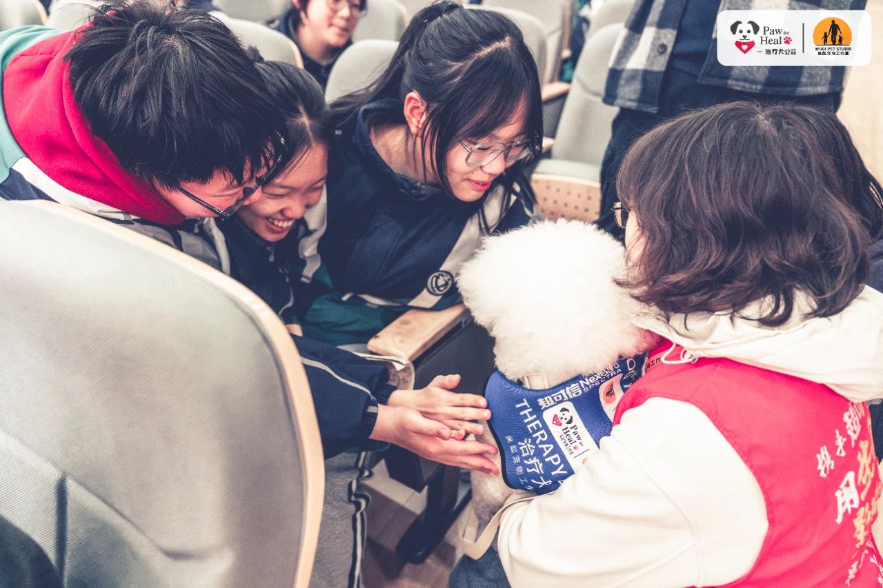 活动伊始,同学们通过预热视频和主持人的讲解,了解到治疗犬公益项目和动物辅助治疗((Animal-Assisted Therapy,AAT)),又称宠物疗法。接着,治疗犬公益项目的志愿者带领各自的治疗犬依次上台进行介绍,让同学们了解了每只治疗犬的基本状况和抚慰技能。在互动环节中,同学们被分为五组,每组分配一只治疗犬,供同学们接触互动。治疗犬一经下场,便被同学们热情包围。同学们积极与治疗犬的主人进行交流,了解治疗犬的来历,学习如何与治疗犬进行专业互动。在和谐而温馨的氛围中,同学们放下忧虑与顾忌,彼此流露出真诚与善意。