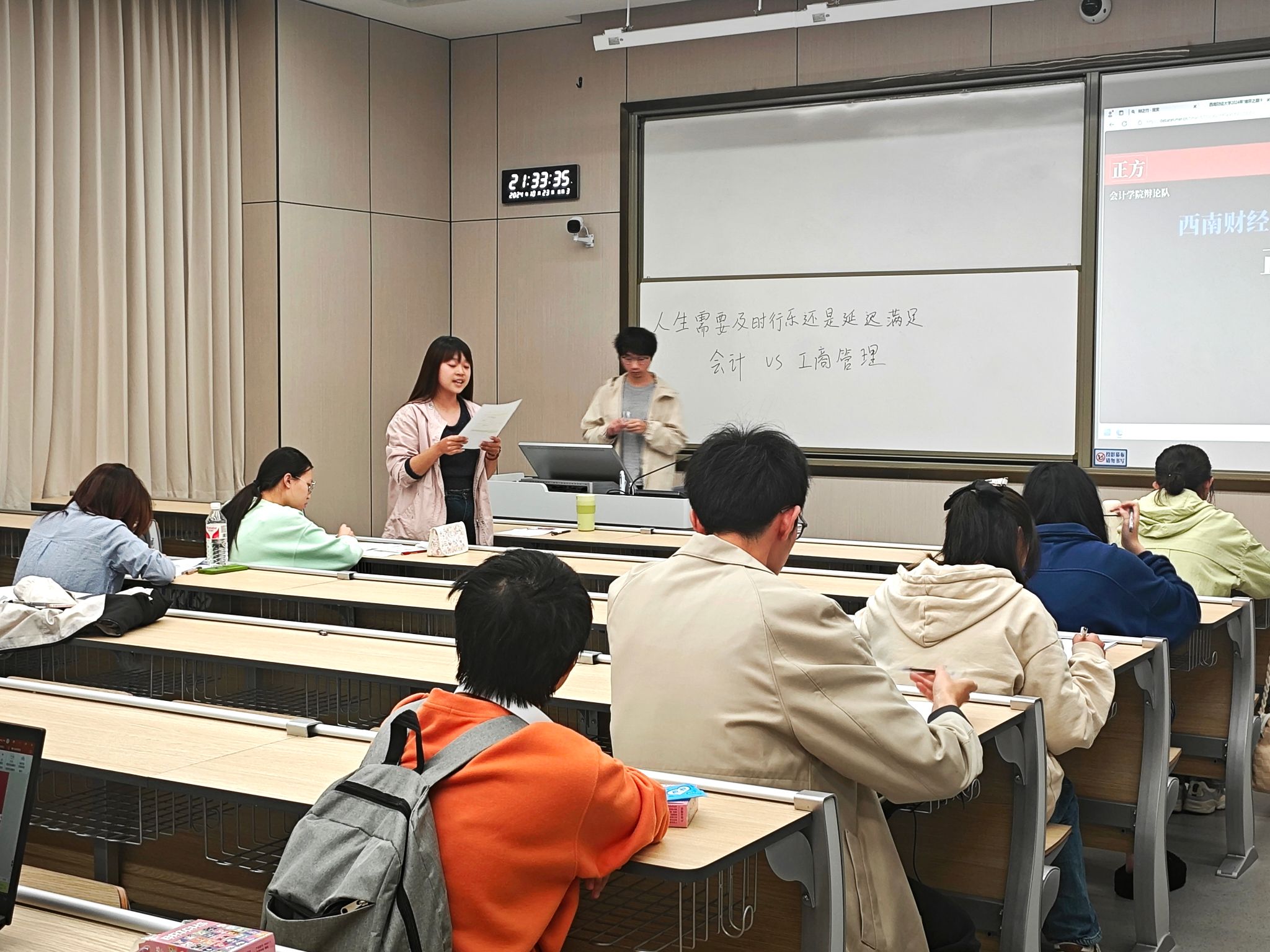 正方会计学院学生代表主张“及时行乐”,他们认为活在当下,享受当下的工作、学习和生活是人生的重要部分。聚焦当下,认真对待当下的学习、工作和生活,积极行动,主动而为,但是也会着眼未来。反方工商管理学院同学则坚持“延迟满足”,他们认为通过努力和忍耐,未来可以获得更大的满足和成功。辩论过程中,双方辩手引经据典,逻辑严密,展现了良好的辩论素养和团队合作精神。活动形式新颖,不仅为两院学生提供了一个展示辩论才华的平台,也为在场的每一位观众带来了一次心灵的触动。