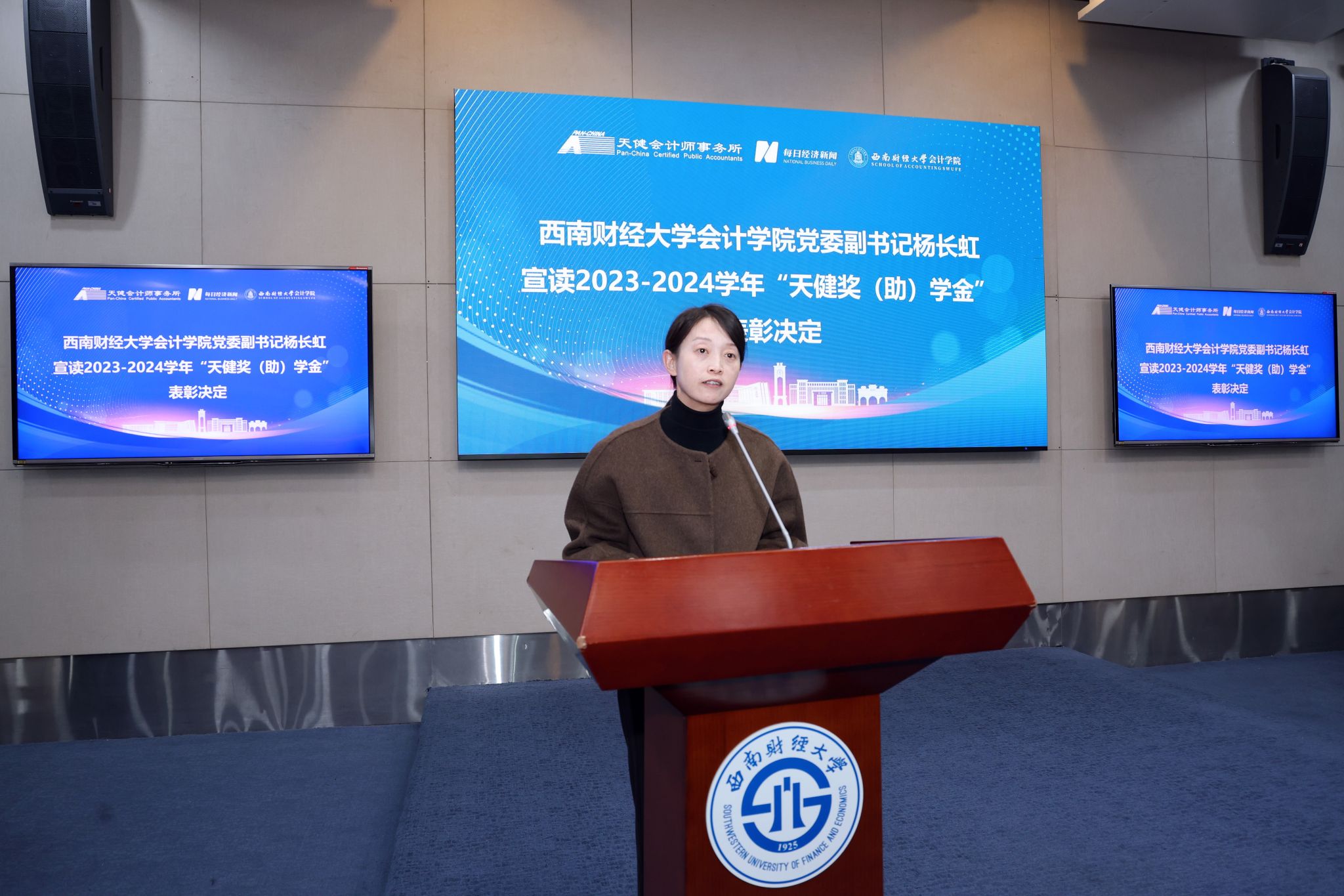 在“天健奖(助)学金”颁奖环节,会计学院党委副书记杨长虹宣读2023-2024学年“天健奖(助)学金”的表彰决定,与会领导为天健奖学金获奖学生颁奖。“天健奖(助)学金”由天健会计师事务所捐赠设立,激励着我院学子致知力行,以更加优异的成绩与切身实践回馈社会,努力成长为理想远大、品学兼优的社会主义建设者和接班人。