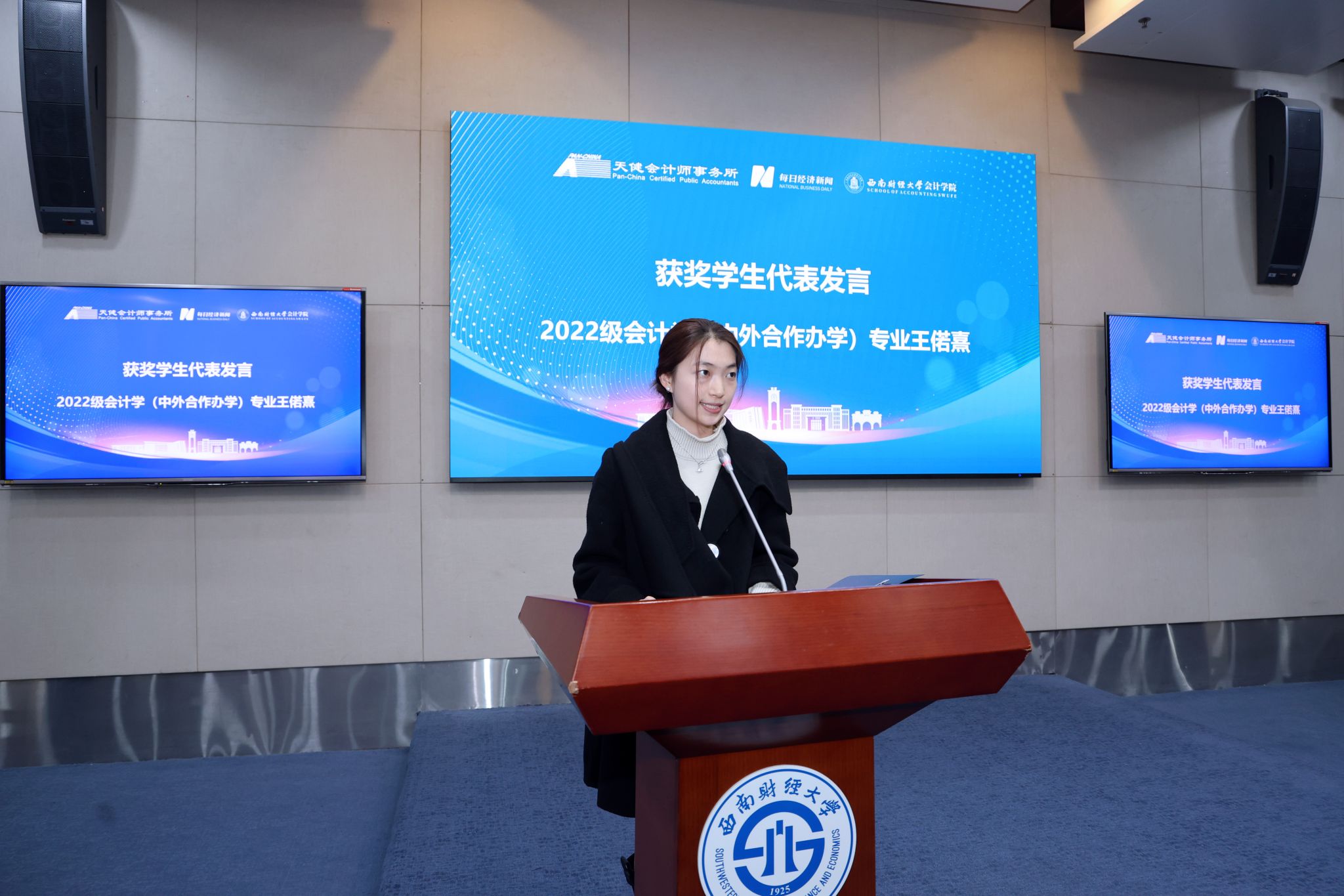 2022级会计学(中外合作办学)专业的王偌熹同学作为获奖学生代表发言,她真诚感谢学院的栽培帮助和天健会计师事务所给予的鼓励,并表示今后定将做好表率,继续学好专业知识,练就过硬本领,勇担时代重任。