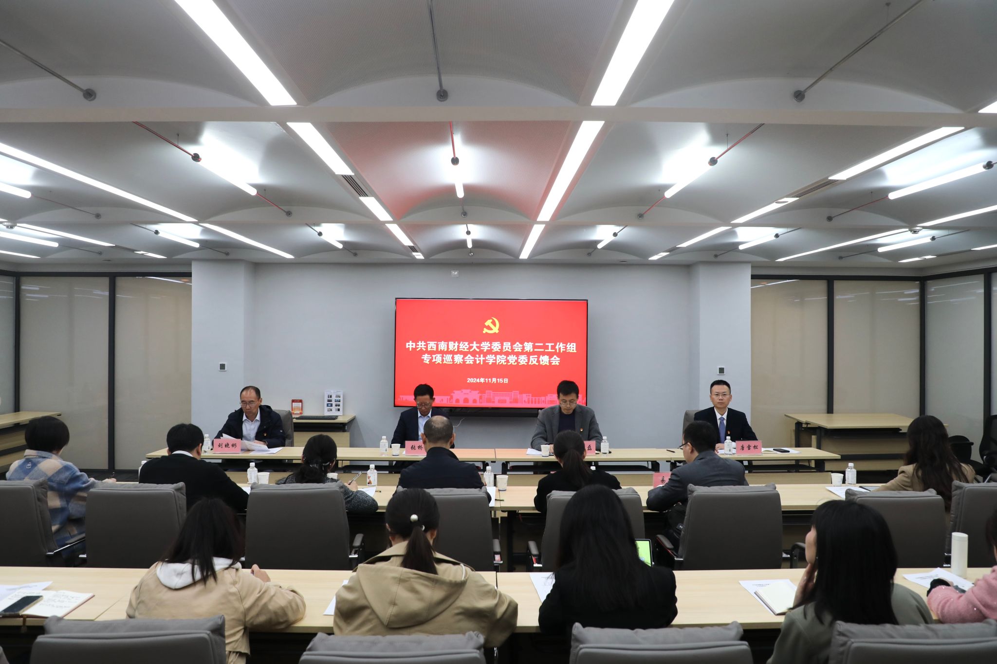 根据学校党委统一部署,11月15日上午,学校党委第二工作组专项巡察会计学院党委反馈会在诚正楼645会议室召开。学校党委巡察办主任赵磊、第二工作组副组长张桥云出席反馈会议。会计学院党政班子全体成员、教师党支部书记、系所(中心)负责人、教授代表、中青年教师代表、科级干部等参加会议。会议由学院院长唐雪松主持。