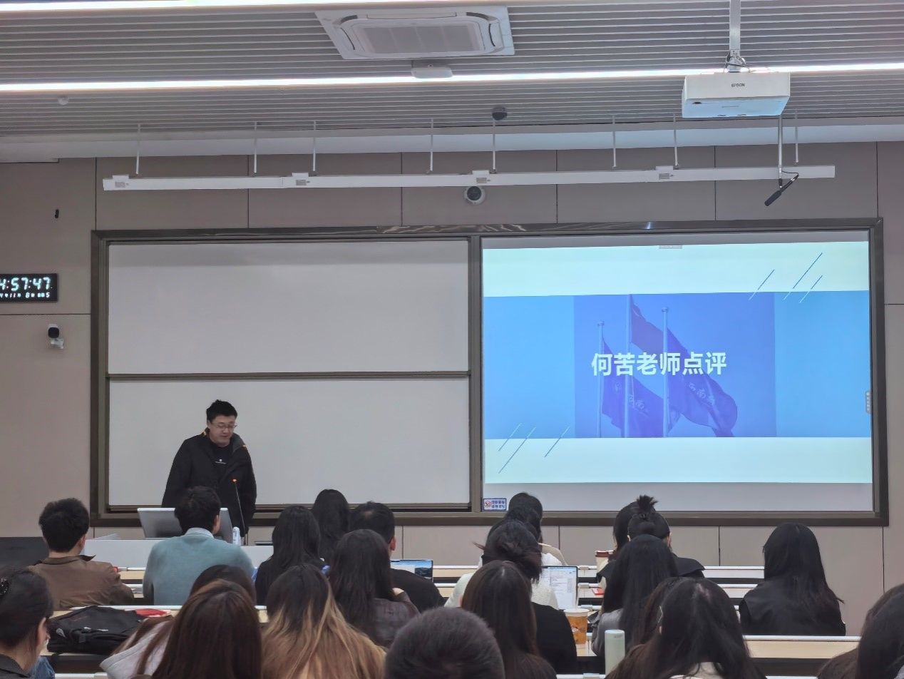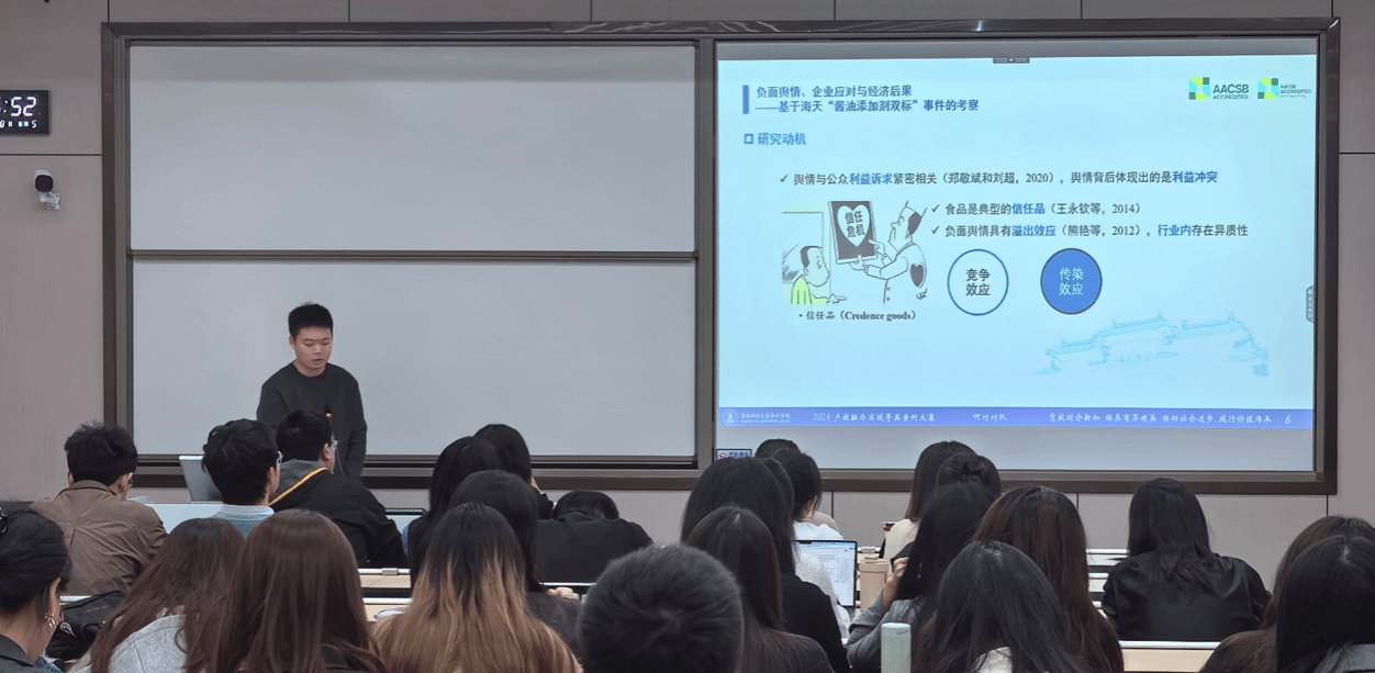 获奖者代表陈柏桥、刘亮、袁童话同学分别就案例获奖论文《负面舆情、企业应对与经济后果——基于海天“酱油添加剂双标”事件的考察》和实证获奖论文《产业链“链长制”与关键核心技术突破-机制与效应》《数字新基建对企业ESG表现的影响——基于“智慧城市”试点的准自然实验》进行分享交流。蔡利、何苦两位老师在点评中强调,学术研究应当紧密结合会计背景,使论述更加专业且具有说服力,同时注意论文结构的严谨性和条理性,确保论点清晰、论证充分。