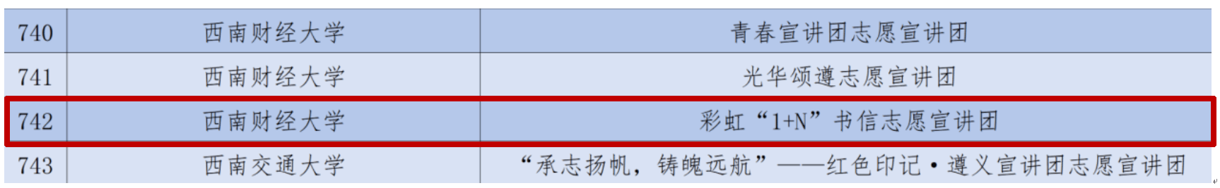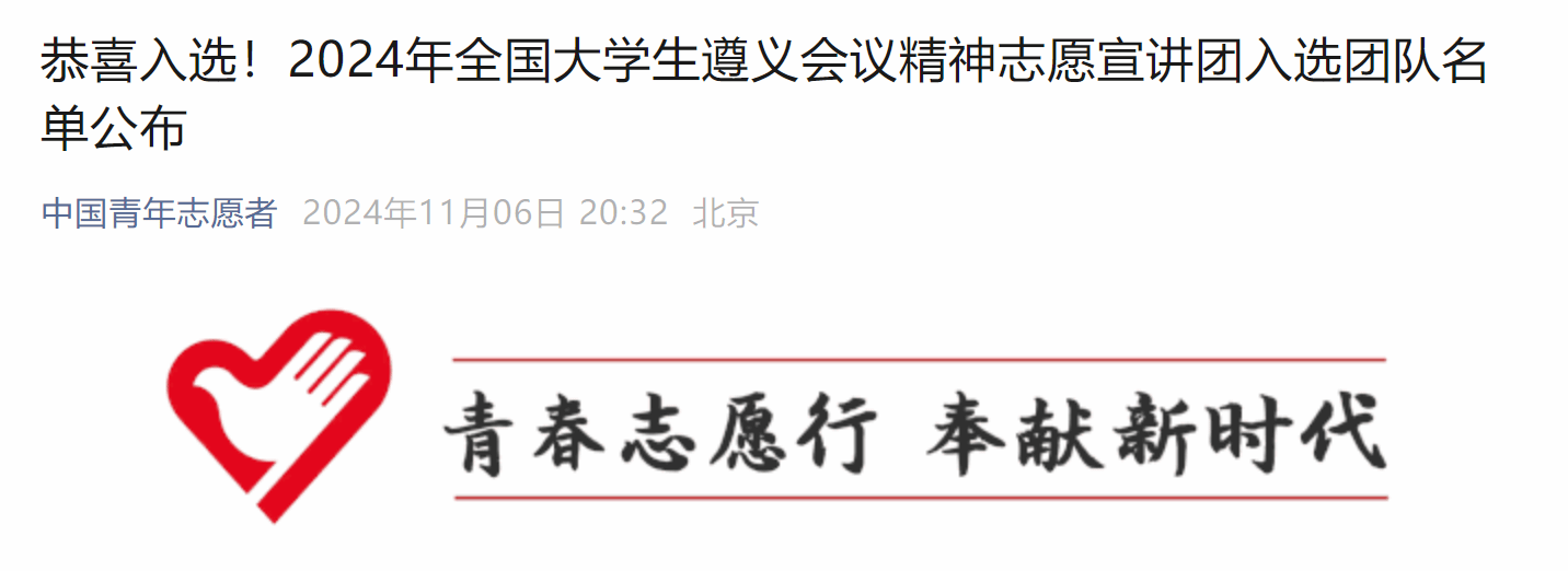 为深入学习宣传贯彻习近平新时代中国特色社会主义思想和党的二十届三中全会精神,深入贯彻落实习近平总书记提出的“传承红色基因、讲好遵义故事”的重要要求,落实“强国复兴有我”群众性主题宣传教育活动相关要求,引导青年学生弘扬遵义会议精神,赓续红色血脉,团中央青年志愿者行动指导中心联合有关单位,面向全国高校遴选相关大学生志愿宣讲团队,会计学院彩虹“1+N”书信志愿宣讲团成功入选。