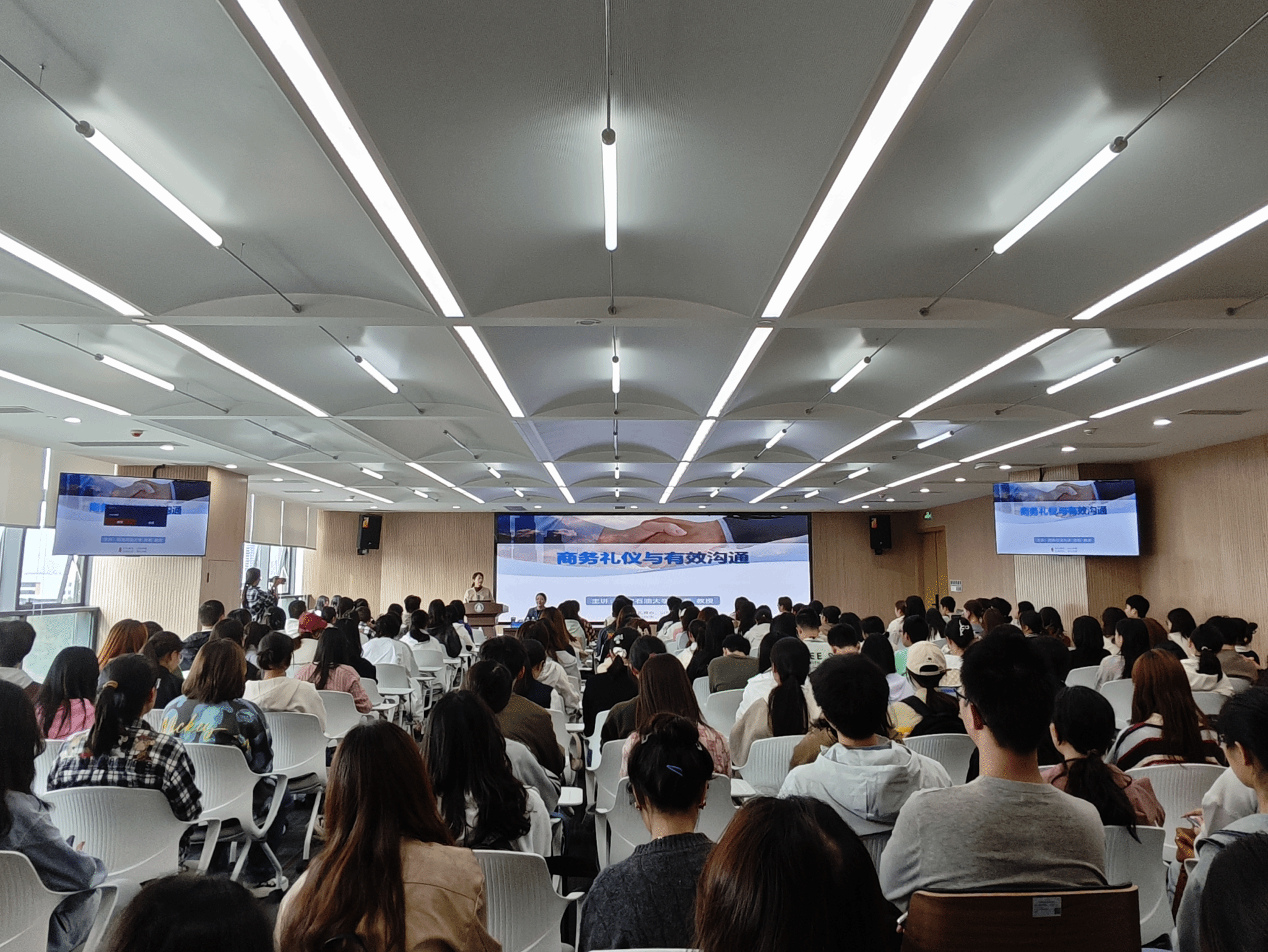 林莉教授先以握手礼仪为例点出礼仪在工作、社交等场合的标准与意义,接着从语言、穿着、坐姿、站姿等方面剖析影响礼仪的关键因素,随后结合面试、会议、调研等实际案例讲解商务礼仪技巧与沟通策略,并通过现场演示和互动带同学们进行练习,最后强调其对个人职业发展的积极影响,鼓励同学们培养相关能力。